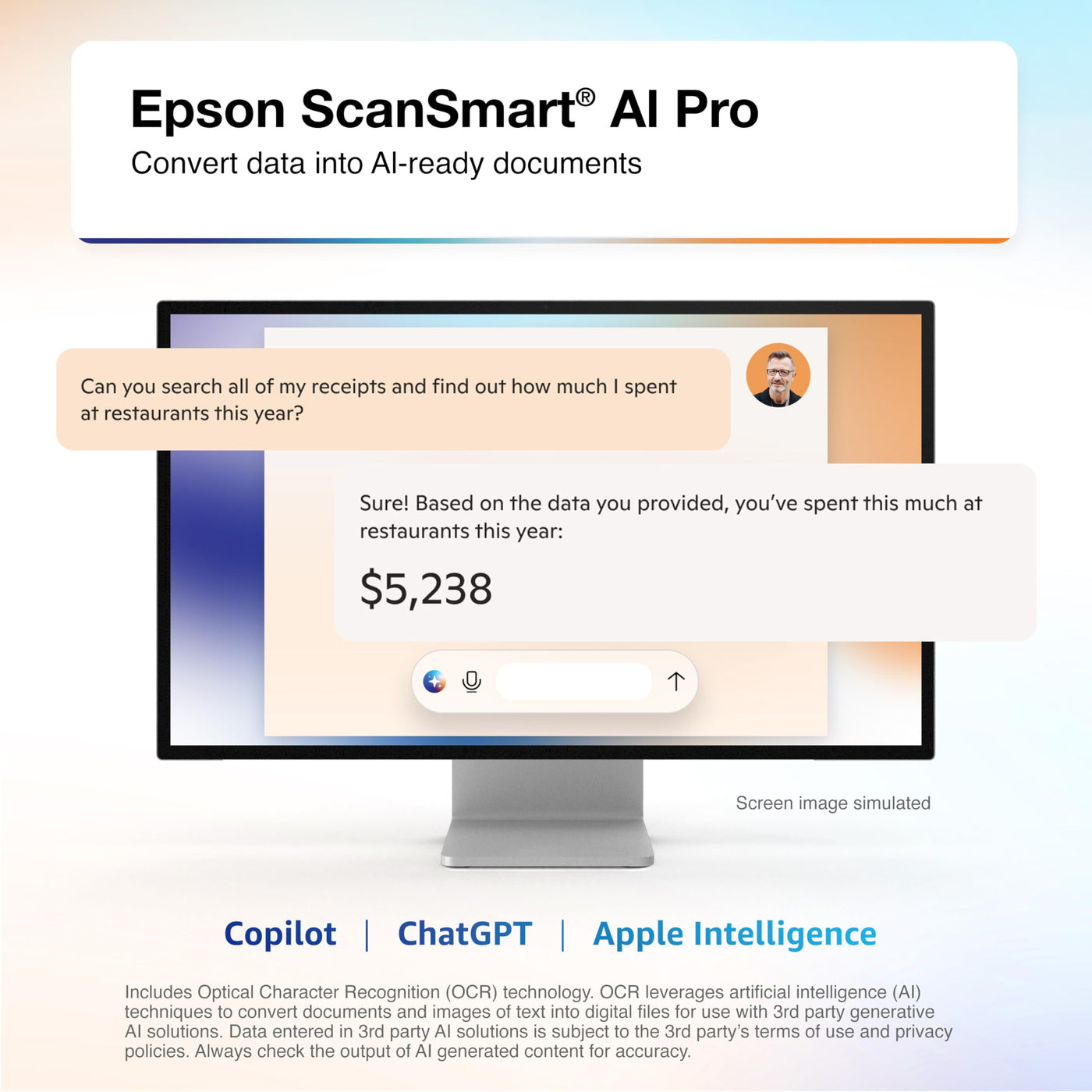Unleash The Power Of Ai With The Epson Rapidreceipt Rr-600W Dedicated Business Scanner.Driven By Epson Scansmart Ai Pro Technology, Youll Quickly And Intelligently Convert Scanned Information Into Smart Digital Data - Making Your Documents Ai-Ready For Microsoft Copilot, Apple Intelligence, Chatgpt Workflows And More.Going Beyond Simple Document Capture, The Rapidreceipt Rr-600W Scanner Utilizes An Extensive Data Model Of Various Invoices And Receipts To Quickly Turn Stacks Of Unorganized Paperwork Into Categorized Digital Data That Easily Integrates Into Financial Applications Such As Quickbooks And Turbotax.The Rapidreceipt Rr-600W Helps Increase Your Productivity With Fast Scanning Up To 35 Pages Per Minute, Delivering 10 Times Faster Duplex Scanning Than A Multifunction Printer4. Plus, Advanced Features Like A 100-Page Automatic Document Feeder And The Ability To Create Searchable And Editable Pdfs. While The Built-In 4.3'' Color Touchscreen Allows For Pc-Free Scanning Directly To An Email Account, Cloud Service5 Or Usb Drive.One Of The Smartest Investments You Can Make For Your Business, The Epson Rapidreceipt Rr-600W Business Scanner, Powered By Scansmart Ai Pro, Enables You And Your Business To Stay Organized And Efficient By Unleashing The Power Of Ai.