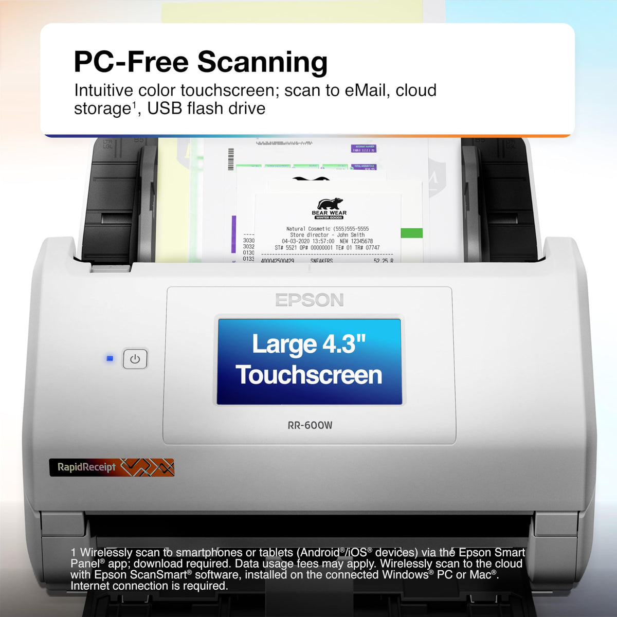 Q: Can I scan documents directly to cloud storage or email without a PC?A: Yes, the Epson RapidReceipt RR-600W features an intuitive 4.3-inch color touchscreen that allows you to scan documents directly to an email account or cloud storage services without the need for a PC.