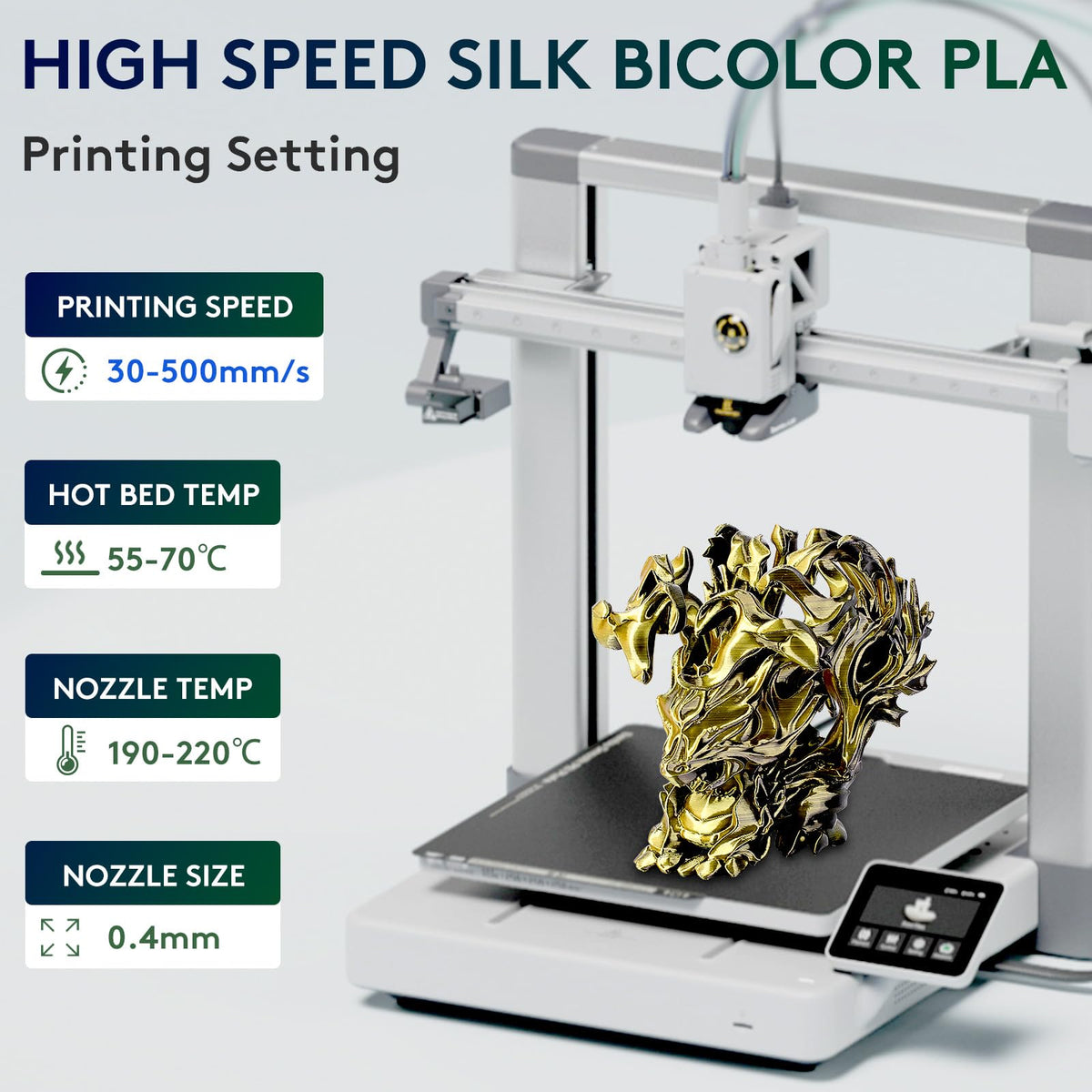 Name:175Mm Silk Dual Color Pla Filament Diameter: 175Mmnbsp Tolerance: A 003Mm Net Weight: 1Kgspool Hot Bed Temp: 60-70 Printing Temperature: 180-210 Recommended Print:Nbsp Remote Printer: 190-210, 4-6Mm, 50Mms Proximity Printer: 180-200, 08Mm, 35-40Mms