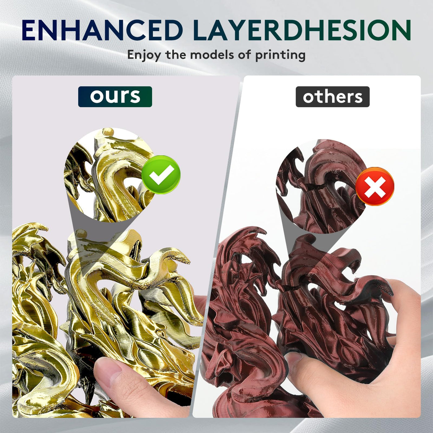 Q: What are the benefits of using Silk PLA filament for 3D printing?A: Silk PLA filament provides a stunning pearlescent finish and a gorgeous silk surface for your prints. It also features strong layer adhesion, reducing warpage and print failure, making it perfect for high-quality 3D models.