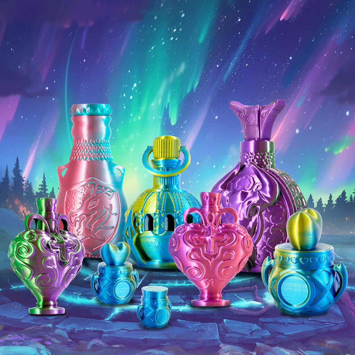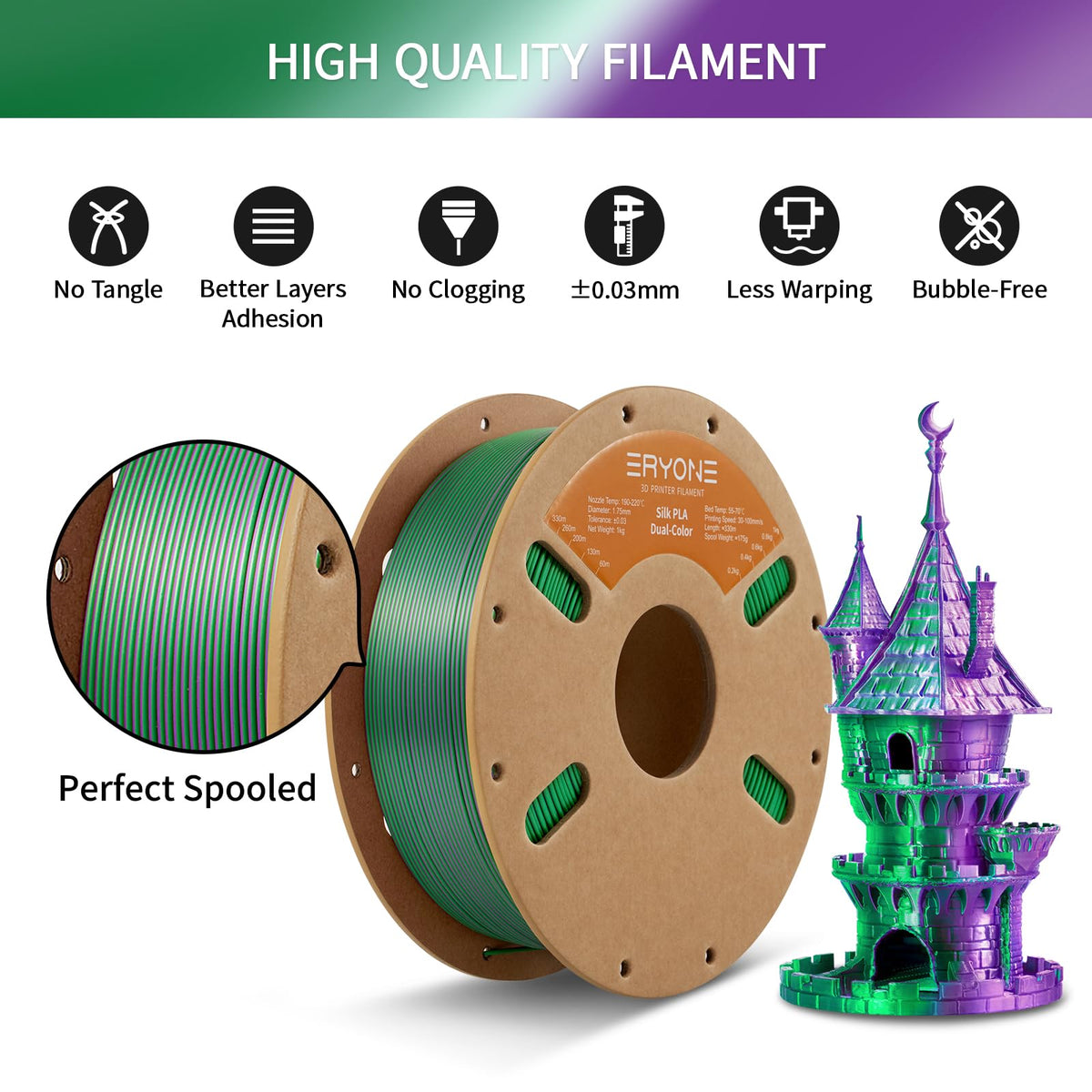 Q: How does the dual color feature work in this filament?A: The dual color feature of the ERYONE Silk Filament is achieved by extruding two individual colors into one filament strand. You can change the visible color by rotating the filament to different orientations during printing.