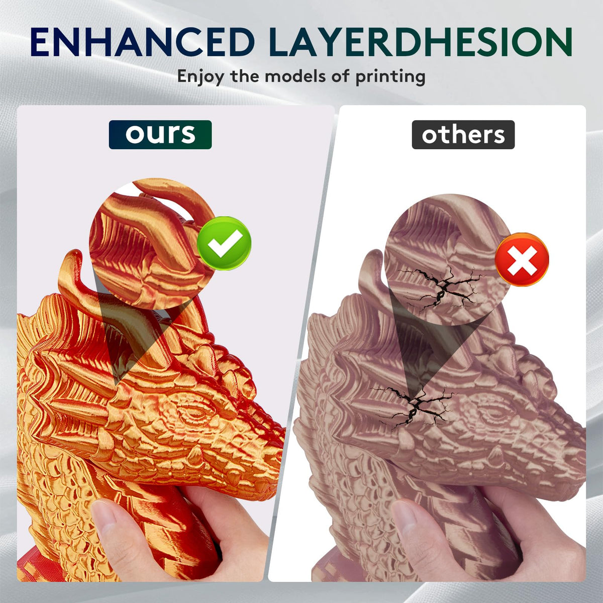 Q: What are the benefits of using this silk PLA filament over standard PLA?A: The ERYONE Silk Dual Color PLA filament offers several advantages over standard PLA, including a unique pearlescent finish, strong layer adhesion, and reduced warping or stringing. This results in smoother prints and enhanced visual appeal for your 3D projects.