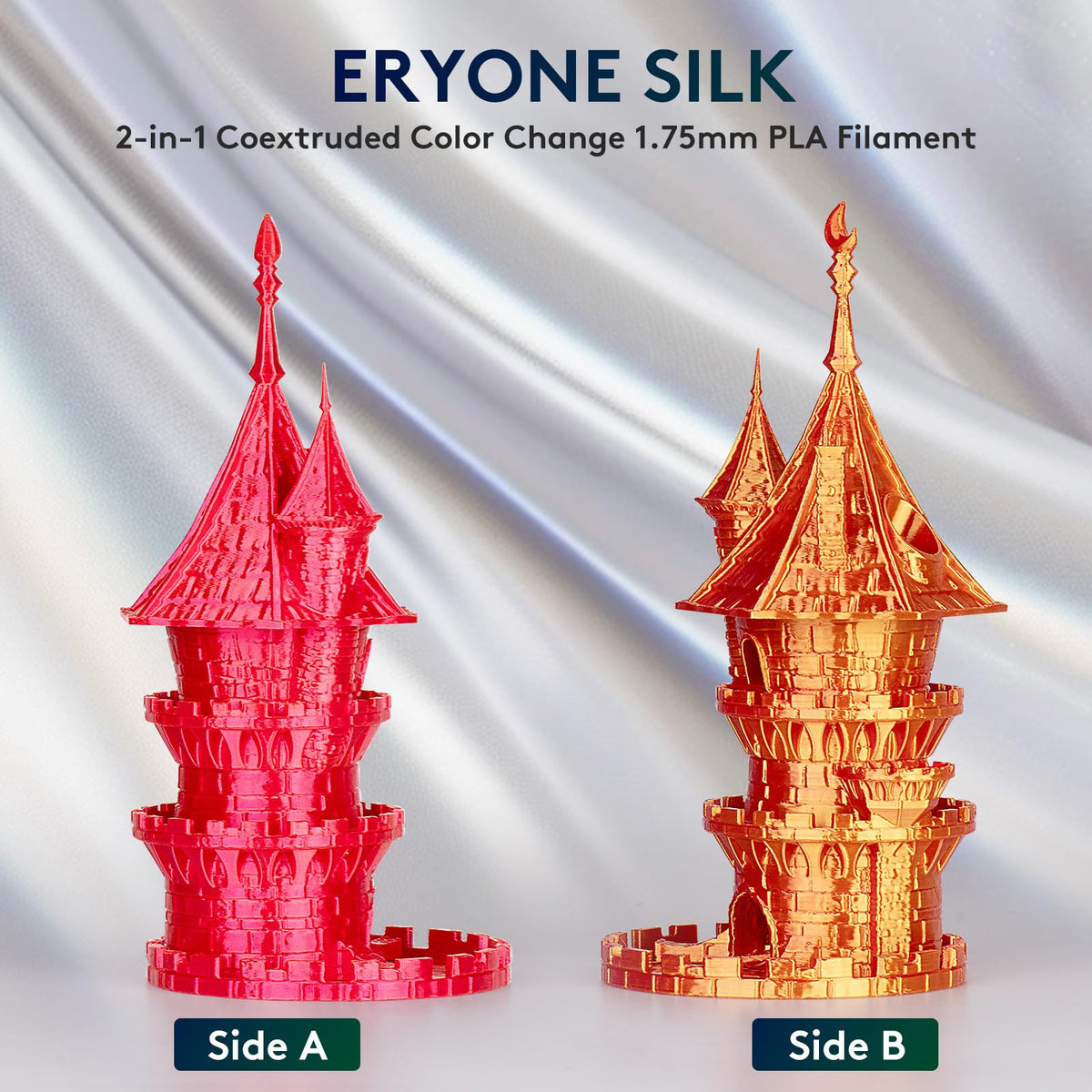 Q: How does the dual-color effect work with this filament?A: The ERYONE dual-color silk filament is made from two individual colors that are extruded into one strand. By rotating the filament during printing, you can change the visible color, allowing for unique color blending effects in your 3D printed parts.