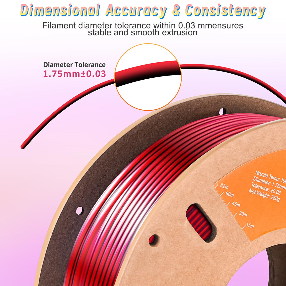 Name:1.75Mm Silk Dual Color Pla Filament Diameter: 1.75Mm Tolerance: 0.03Mm Net Weight: 1Kg/Spool Hot Bed Temp: 60-70? Printing Temperature: 180-210? Recommended Print: Remote Printer: 190-210?, 4-6Mm, 50Mm/S Proximity Printer: 180-200?, 0.8Mm, 35-40Mm/S