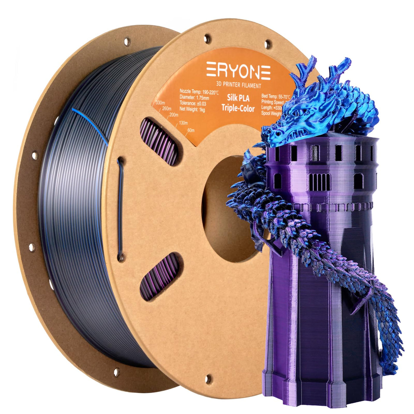 Q: What is the diameter and tolerance of the ERYONE Silk Tri Color PLA Filament?A: The ERYONE Silk Tri Color PLA Filament has a diameter of 1.75mm with a tolerance of ± 0.03mm, ensuring precise and consistent printing results.