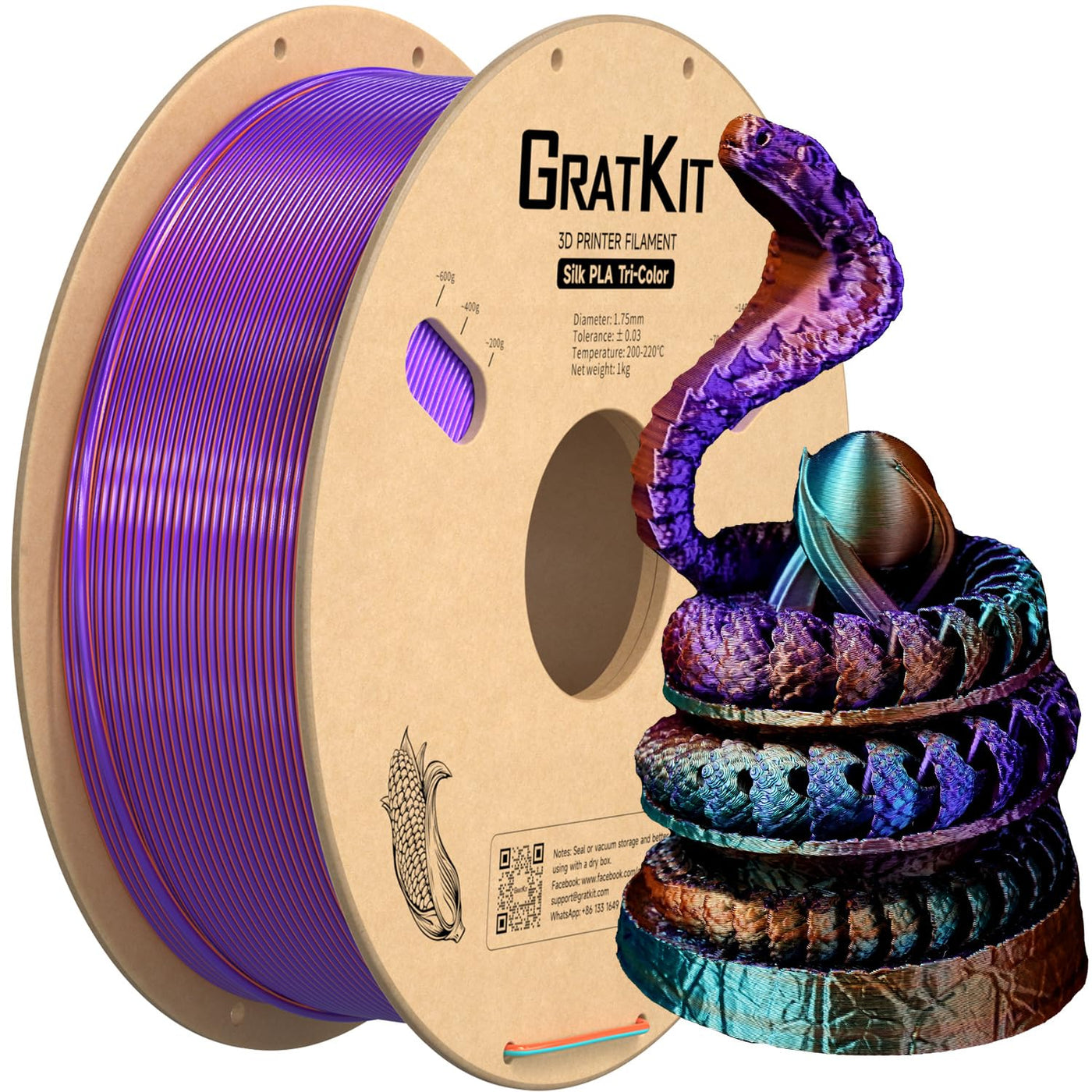 ?Magic Tri-Color Effect?Gratkit Magic Tri Color Pla Has 3 Colors In One Strand Of Filament, Turning Out Amazing Tri Color Change Effect On Prints; | ?Silk Coextrusion Pla?Gratkit Silk Coextrusion Pla Shows Silk Shiny Effect On Printed Stuffs, Makes Prints Looks Charming; | ?Moisture Resistant Pro?Gratkit 3D Printing Filament Went Through A 24-Hour Drying Process In Thermostatic Room Before Sealed Packing. Moreover, It Gets Environmental Glue Attached On Reel To Make Sure The Reel Stands Longer After Unpacking. | ?Dust Free Storage?Gratkit Pla Filament Gets Zipper Bag Included For For Filament Storage After Unpacked To Keep Filament Away From Dust. It Is Also Recommended To Zip Remaining Filament Together With Desiccant Bag In The Zipper Bag. | ?Environmental Packing?Gratkit Pla 3D Printer Filament Uses Recyclable Cardboard Reels For Environmental Purpose.