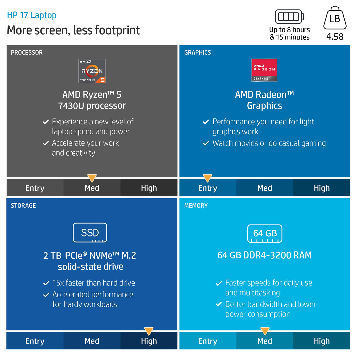 Hp 17.3 Touchscreen Laptop - Amd Ryzen 5 7430U - Windows 11 Prostatement:Original Seal Is Opened For Upgrade Only. If The Computer Has Modifications, Then The Manufacturer Box Is Opened For It To Be Tested And Inspected And To Install The Upgrades To Achieve The Specifications As Advertisedfeaturesprocessor: Amd Ryzen 5 7430U (6-Core, Up To 4.5Ghz)Memory: 64 Gb Ddr4 Ramsubstantial High-Bandwidth Ram To Smoothly Run Your Games And Photo- And Video-Editing Applications, As Well As Multiple Programs And Browser Tabs All At Once.Internal Storage: 2 Tb Pcie Nvme M.2 Ssdsave Files Fast And Store More Data. With Massive Amounts Of Storage And Advanced Communication Power.Graphics: Integrated Amd Radeon Graphicswireless Networking: Wi-Fi 6 (Wireless-Ax)Wireless Connectivity: Bluetooth 5.3Screen: 17.3 Inch, Brightview, Hd+ (1920 X 1080) 250-Nits Displaytouchscreen: Noaudio: Hd Audio With Stereo Speakersfront-Facing Camera: Integrated Hp Truevision 720P Hd Camera With Privacy Shutterdual Array Microphones: With Two Microphones And Advanced Noise Reduction Software, Youll Always Sound Crystal Clear When You Video Chat Or Record.Keyboard: Full-Size Keyboard With Numeric Keypad; Hp Imagepaddimension: 10.15 W X 15.78 L X 0.78 H, 4.58 Lbsports:1X Usb Type-C2X Usb Type-A1X Hdmi 1.4B1X Headphone/Microphone Combination Jackmanufacturers Warranty: 1 Year