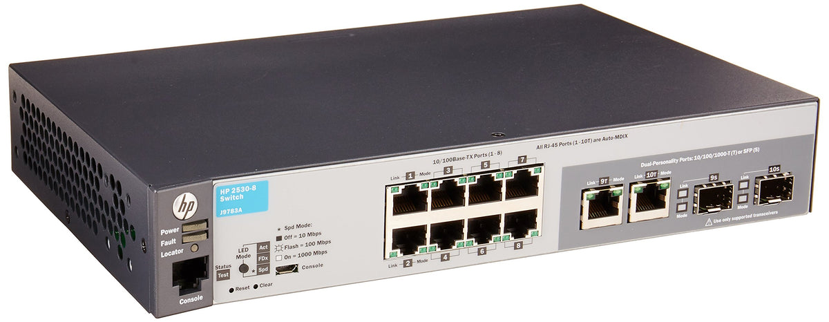 Q: What are the key features of the HP 2530-8 Ethernet Switch?A: The HP 2530-8 Ethernet Switch features 8 x 10/100 ports and 2 combo Gigabit SFP ports, making it ideal for small to medium-sized networks. It is a managed switch that allows for easy configuration and monitoring, and is designed for desktop, rack-mountable, or wall-mountable use.