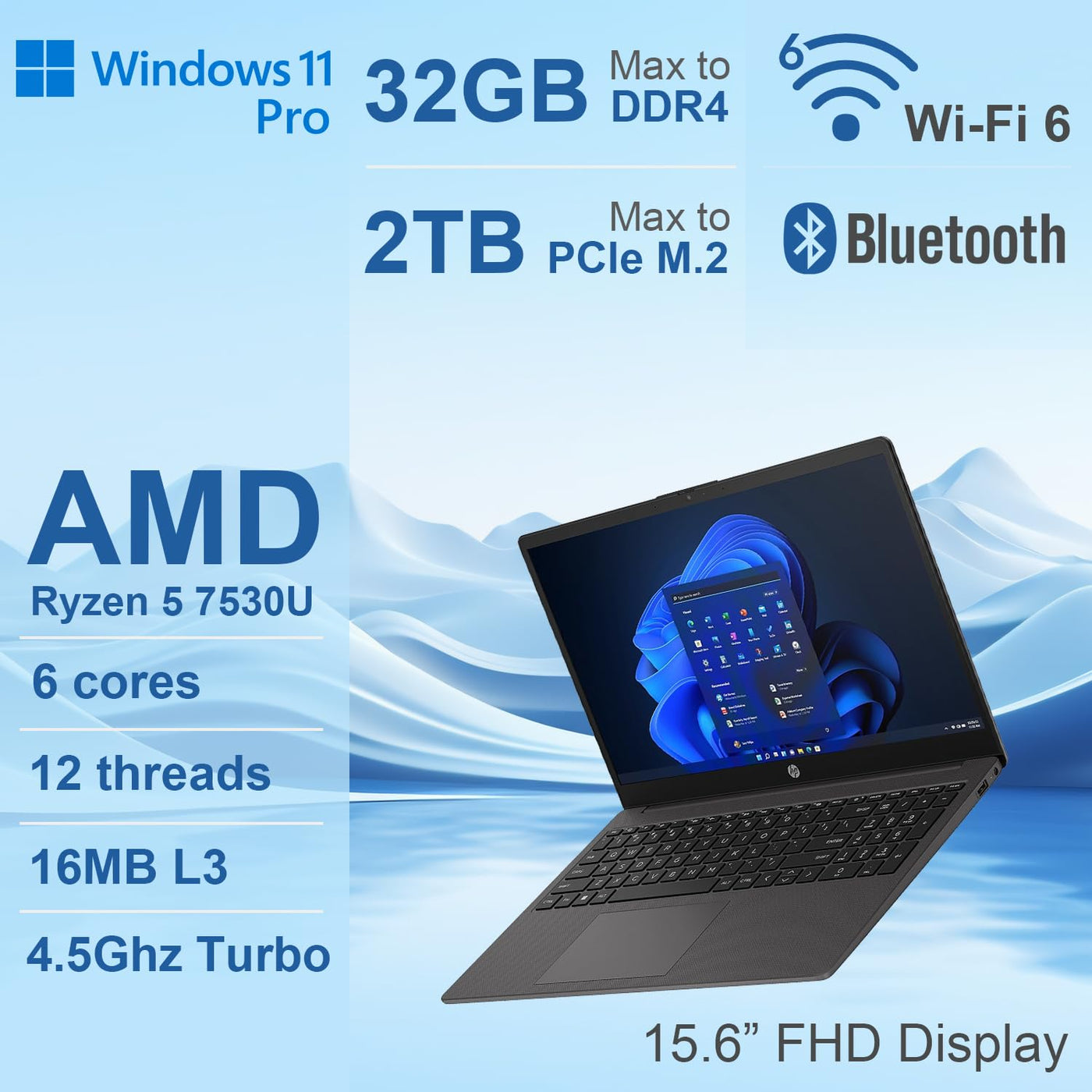 Key Features And Benefits: Cpu: Amd Ryzen 5 7530U (6 Cores, 12 Threads, 16 Mb L3 Cache, Base Frequency At 2.0 Ghz, Up To 4.5 Ghz At Max Turbo Frequency) Memory: Up To 32Gb Ddr4 Ram Hard Drive: Up To 2Tb Pcie M.2 Solid State Drive Operating System: Windows 11 Pro Display: 15.6-Inch Diagonal, Fhd (1920 X 1080), 60Hz, 250 Nits, Ips, Micro-Edge, Anti-Glare Graphics: Amd Radeon Graphics Bundle: Ap10000Qcd-Dgt-Cwh 10,000Mah Power Bank Ports: 1 X Usb 3.2 Type-C 2 X Usb 3.2 Type-A 1 X Hdmi 1 X Headphone/Microphone Combo Jack 1 X Power In Wireless Connectivity: Wi-Fi 6 + Bluetooth 5.3 Webcam: Hd Camera Optical Drive: None Dimensions: 14.17 X 9.29 X 0.73 Inches Weight: 3.3 Lbs Color: Black