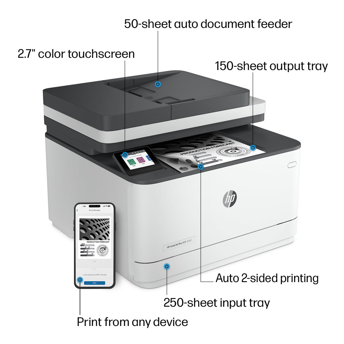 Get High-Speed Printing And Scanning, And Connectivity For Seamless Workflow And Management With The Laserjet Pro Mfp 3101Fdw. Get Fast Speeds And Powerful Productivity With The Multifunction Laserjet Pro 3101Fdw. Get Laser Quality Black & White Printing For All Your Business Documents. Set Up And Manage Printers In Multiple Locations With A Single Dashboard.