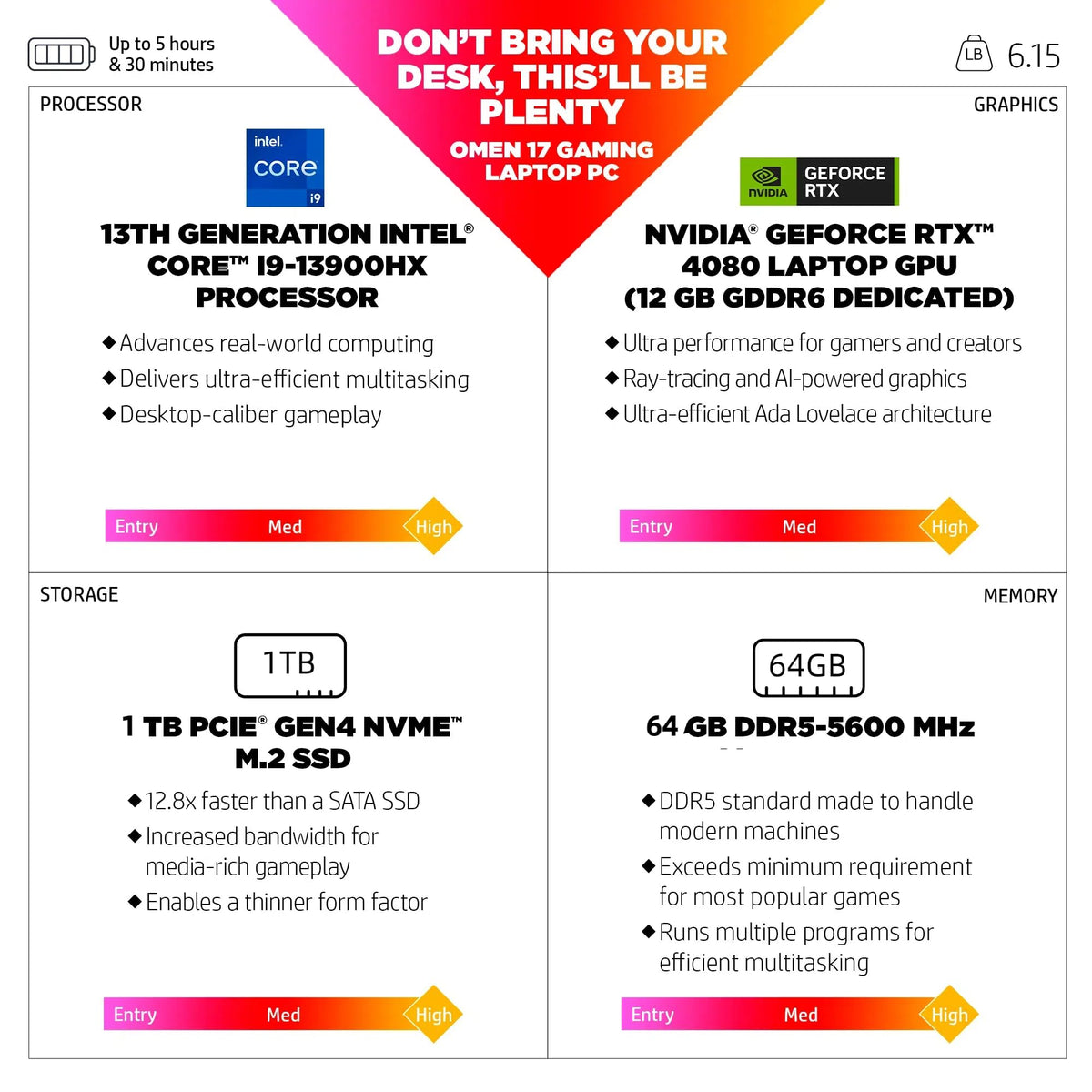 Hp Omen 17 Gaming Laptop 2024, 17.3 Qhd Ips 165Hz, 13Th Gen Intel 24-Core I9-13900Hx, Geforce Rtx 4080 12Gb, 64Gb Ddr5, 1Tb Ssd,