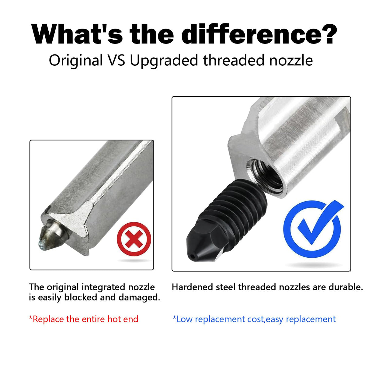 Q: What materials are included in the HysiPrui A1 Hotend Kit?A: The HysiPrui A1 Hotend Kit includes high-quality components: a hardened steel nozzle (0.4mm and 0.2mm), a throat tube heatbreak, a heater block, and a heatsink, all designed to enhance your 3D printing experience.