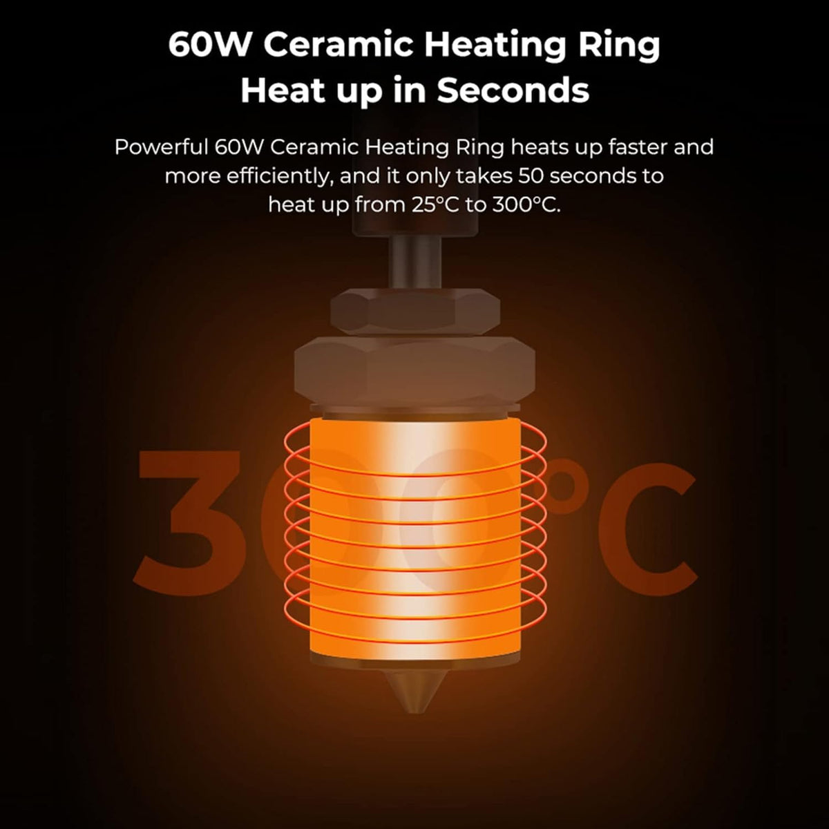 Q: How does the design of the HysiPrui Ceramic Hotend enhance printing efficiency?A: The hotend’s design includes a 360° surrounded ceramic heating ring, which improves heating efficiency and ensures even heat distribution. This results in faster heat up times and supports high-speed printing without issues of leakage or clogging.