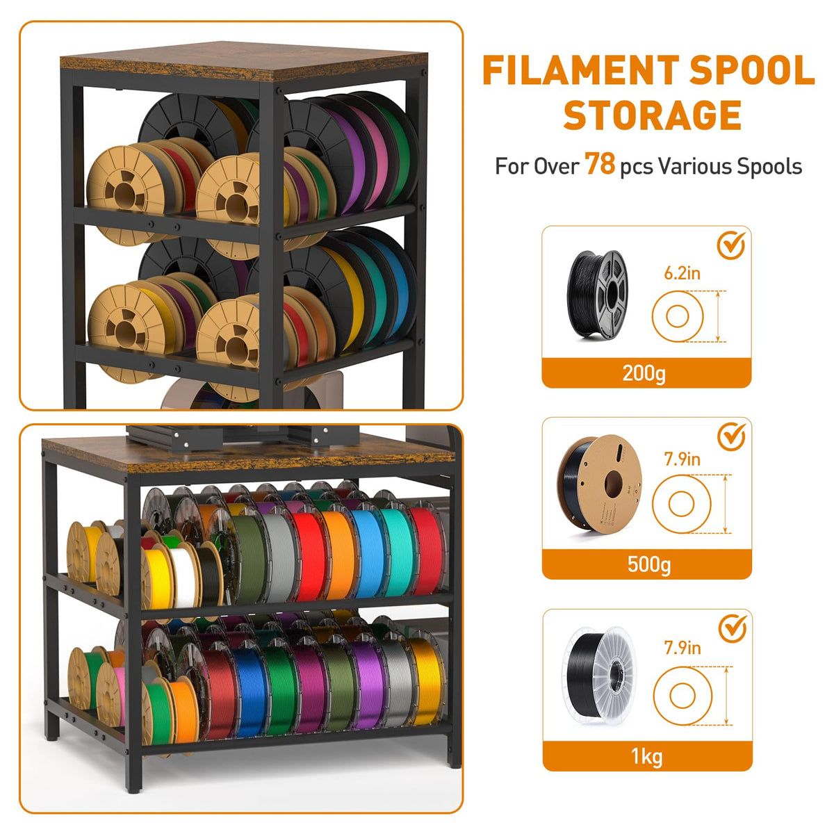 Description: * The Large 3D Printer Stand Features Integrated Storage Solutions, Overall Dimensions (L) 42.3X(W)22.5 X (H)54.5, Fits Most 3D Printers, The Filament Storage Rack Holds A 3D Printer, 74 Spools Of Filament, Unopened 3D Printer Filaments, Filament Dryer, Storage Bags, Toolboxes * Crafted From Premium Wood And A Durable Metal Frame With A Surface Baking Paint Finish, This 3D Printer Rack Is Resistant To Rust And Corrosion. Each Tier Supports Up To 120 Lbs, Ensuring Your 3D Printer Accessories Stay Organized And Secure, Preventing Tipping Or Bending. * A Built-In Power Board And Cord On Top For Easy Connection To Your 3D Printer, Laptop, Or Other Devices, Ensuring Your Setup Stays Powered And Ready. * Six S-Shaped Hooks Keep Trimming Tools Within Reach, Eliminating Time Wasted Searching For Them. * Four Anti-Slip Pads Provide Stability Even On Uneven Surfaces, Preventing Scratches And Wobbling During Operation. * Enhance The Style And Functionality Of Any Space With Our Sleek Black-Framed Filament Shelf Featuring Vintage Panels. Perfect For 3D Printing Studio, Home Workshop, Garage, Workspace, Basement, Or Office, It Seamlessly Integrates Into Any Environment While Providing A Practical Solution For Organized And Efficient Storage Of All Your 3D Printing Essentials. Specifications: Material: Metal+Engineered Wood Color: Brown+Black Maximum Weight: 120 Lbs Style: Vintage, Industrial, Or Contemporary Product Dimension: 42.3L X 22.5W X 54.5H Product Care Instructions: Wipe With A Dry/Wet Cloth Recommended Uses For Products: 3D Printer Stand,3D Printer Table, Filament Storage Rack, 3D Printer Accessories Storage Room Type: 3D Printing Studio, Home, Workshop, Garage, Workspace, Basement, Or Office Package Included: 1X 3D Printer Stand 1X Mounting Hardware 1X Assembly Guide