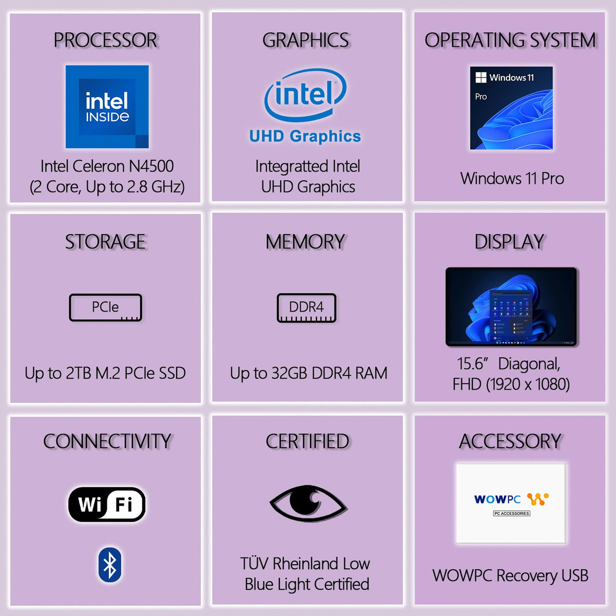 Processor: Intel Celeron N4500 (2 Cores, 2 Threads, Up To 2.8 Ghz) Graphics: Integrated Intel Uhd Graphics Operating System: Windows 11 Pro 64-Bit Memory: Up To 32Gb Ram Hard Drive: Up To 2Tb Ssd M.2 Pcie Nvme Display: 15.6 Diagonal, Fhd (1920X1080) Tn 250Nits Anti-Glare Connectivity:Wi-Fi 6, 802.11Ax 2X2, + Bluetooth 5.2 Ports: 1X Usb-A 2.0 1X Usb-A 3.2 Gen 1 1X Usb-C 3.2 Gen 1 (Support Data Transfer Only) 1X Hdmi 1.4B 1X Headphone / Microphone Combo Jack (3.5Mm) 1X Ethernet (Rj-45) Port 1X Power Connector Built-In Speakers: Stereo Speakers, 1.5W X2, Dolby Audio Keyboard: Full Size Keyboard With Numeric Keypad, Us English Built-In Hd Webcam: Hd 720P With Privacy Shutter Color: Black Dimensions L X W X H (Inches): 14.14 X 9.28 X 0.78 Inches Weight: Starting At 3.75 Lbs