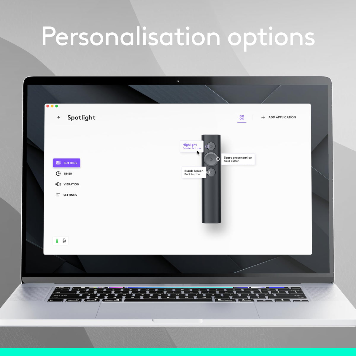 Logitech Spotlight Is A Game-Changing Presentation Remote. Spotlight Allows You To Simply Navigate Slides And Interact With On-Screen Content From Up To 100 Feet Away. The Customizable Timer Sends Vibration Alerts Directly To Hand - And The Advanced Pointer System Allows You To Highlight And Magnify Areas Of Focus In Pixel-Perfect Detail.