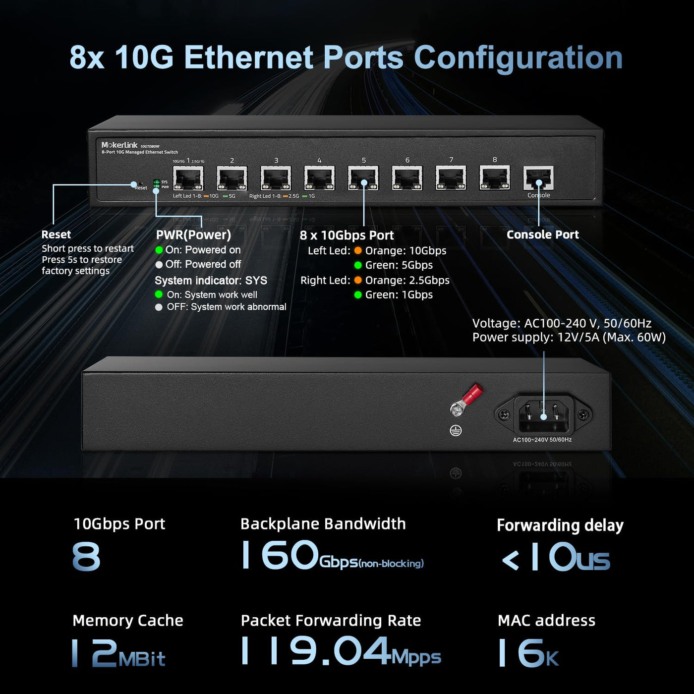 Mokerlink 8 Port 10G Managed Ethernet Switch, 10G/5G/2.5G/1G Auto-Adaptive, L3 Web/Cli Managed, Metal Rackmount Network Switch