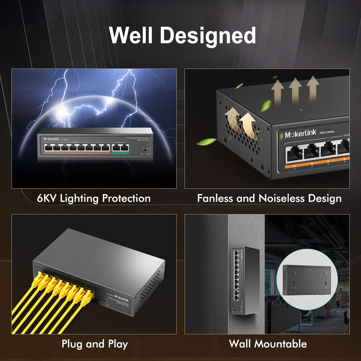 Mokerlink 8 Port Poe Switch With 2 Gigabit Uplink, 802.3Af/At Poe+ 100Mbps, 120W Built In Power, Extend To 250Meter, Metal Plug