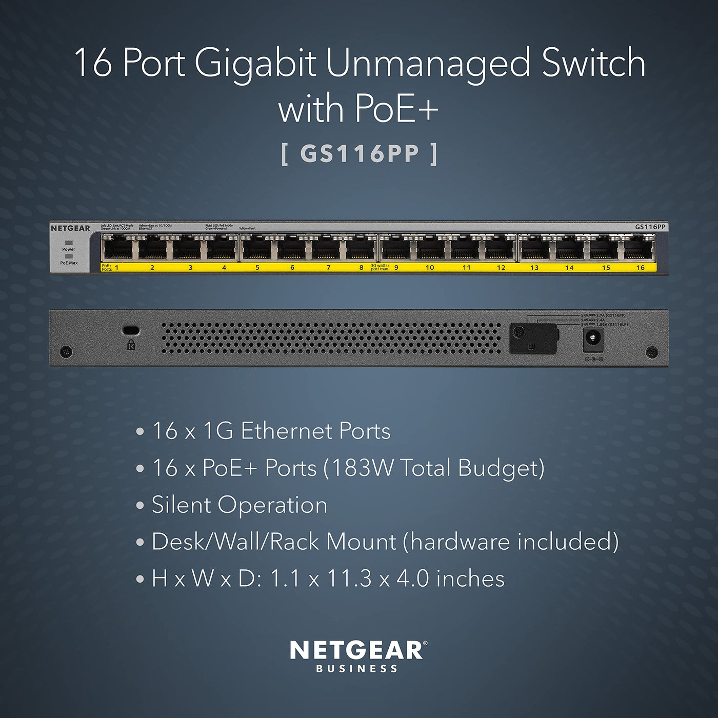 The Netgear Gs116Pp Unmanaged Power Over Ethernet (Poe) Switch Is Designed For Desktop Or Rackmount And Features 16-Port Gigabit Ethernet, 16 X Poe+ Ports With A 183 Watt Budget, Prosafe Lifetime Protection And More.