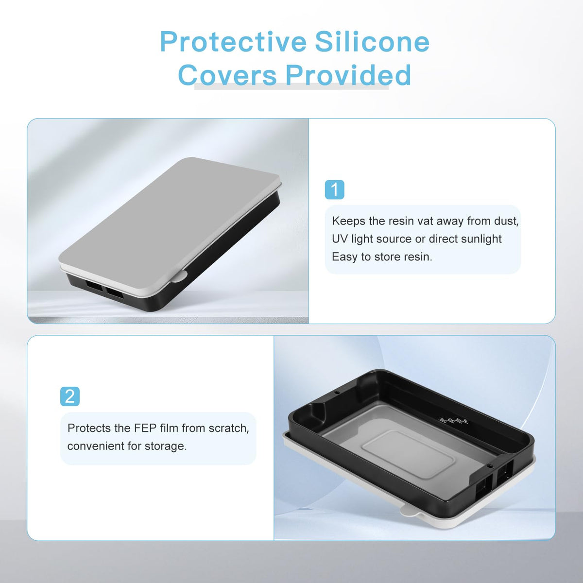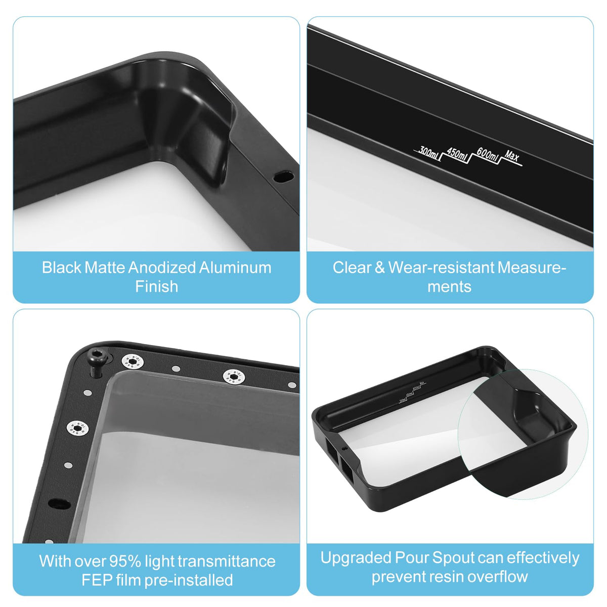 Q: What materials are used in the construction of the resin vat?A: The resin vat is made from durable aluminum alloy, which provides long-term usage, along with a silicone lid and preinstalled FEP film for optimal performance and protection.