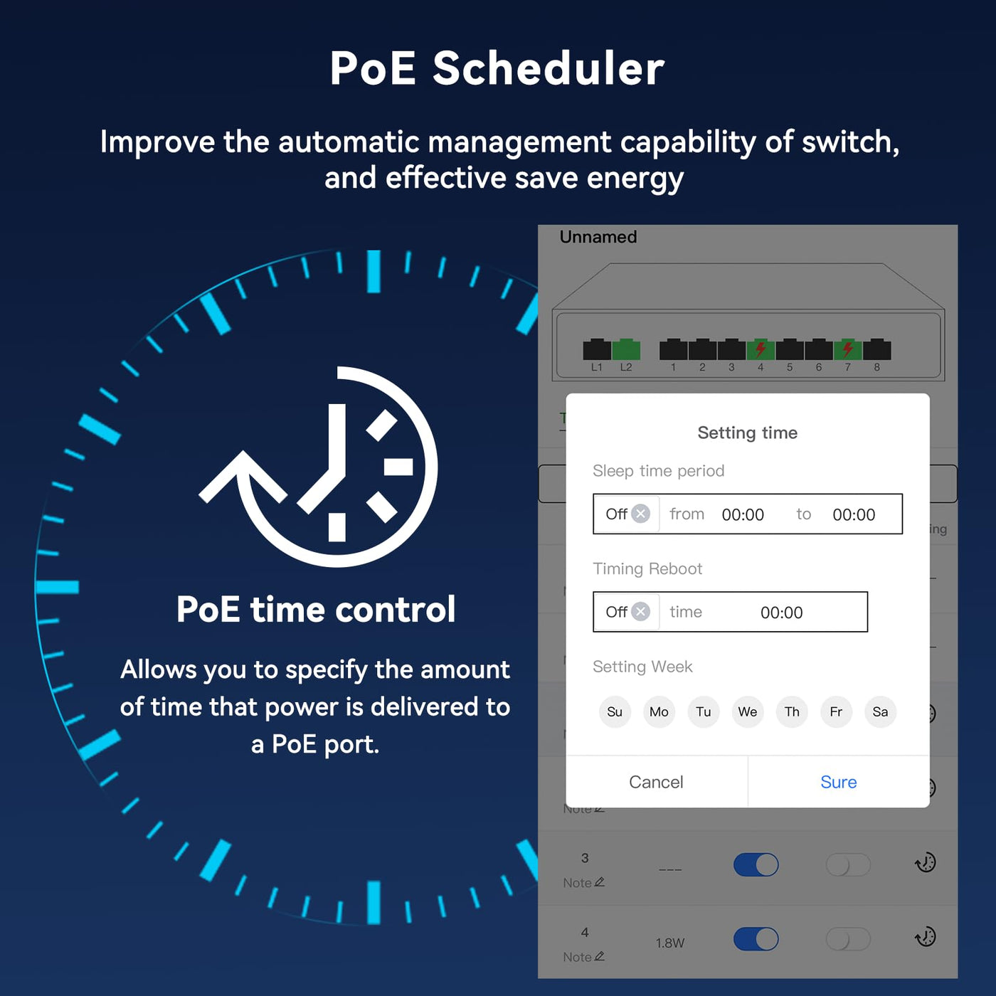 Q: How does the PoE capability work on this switch?A: The PoE capability allows the switch to automatically identify and power PoE devices through its dedicated ports. This eliminates the need for additional power adapters, making it easier to connect devices like IP cameras and WiFi access points.