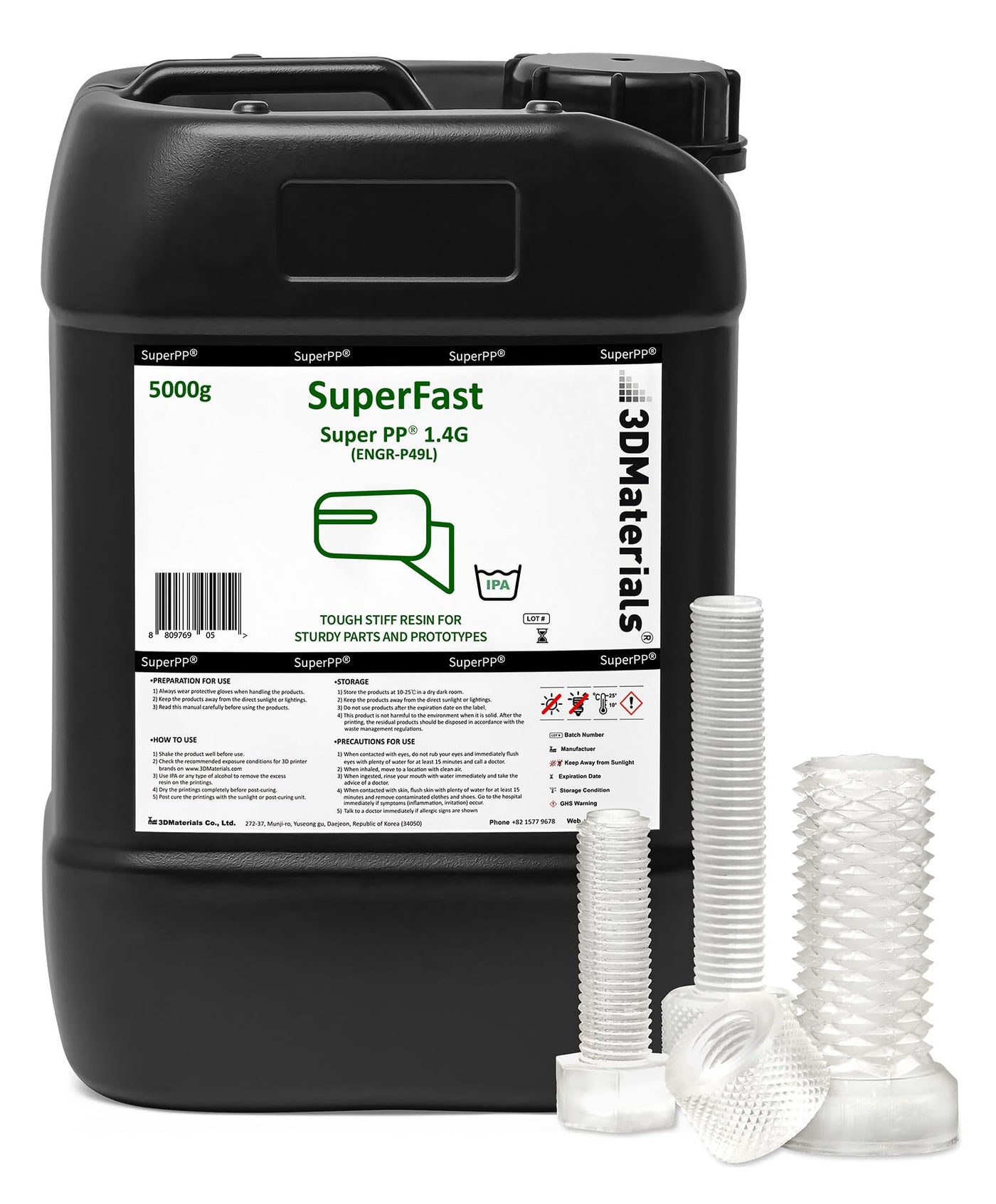 [High Modulus With High Elongation At Break] Superpp Has 1.4Gpa Tensile And 2.4Gpa Flexural Modulus With 25% Elongation At Break. [Fast Printing] Unique Photosensitization Technology Developed By 3Dmaterials Allow For Curing 50Um Layer In 1.3 Secs With Monochrome Lcd. [Save Time And Electricity] Super Fast Printing Save Time And Electricity Bill, Enhance The Productivity Of 3D Printing Farms. [Iso 10993-5] Post-Processed And Cured Superpp Has Passed Iso 10993-5:2009. [Tough & Durable] Revolutionary Oligomers Developed And Synthesized By 3Dmaterials Allow For 3D Printing Parts With Stiffness And Durability At The Same Time. [Compatible To All Lcd Printers] Unique Photosensitization Technology Make Superpp Compatible With All Kind Of Regular And Mono Lcd 3D Printers. [Super Series] Superpp 1.4G (Tough And Durable Like Pp), Superpp 0.9G V-0 (Durable With Flame-Retardant Ul94 V-0), Superpcs (Tough And Durable With 8K Precision), Superflex (Flexible Like Tpu), Superrigid (Ceramic Filled 6.0Gpa Modulus), Superelastic (Flexible Like Silicone), Supersilicone (3D Printable Silicone With Ul94 V-0), Superhdt (Highest Hdt Of 464F(240C)), Supercast (Wax Filled Castable), Superesd V-0 (Electrostatic Discharge Safe With Ul94 V-0) Are Also Available As Engineering Resins From 3Dmaterials.