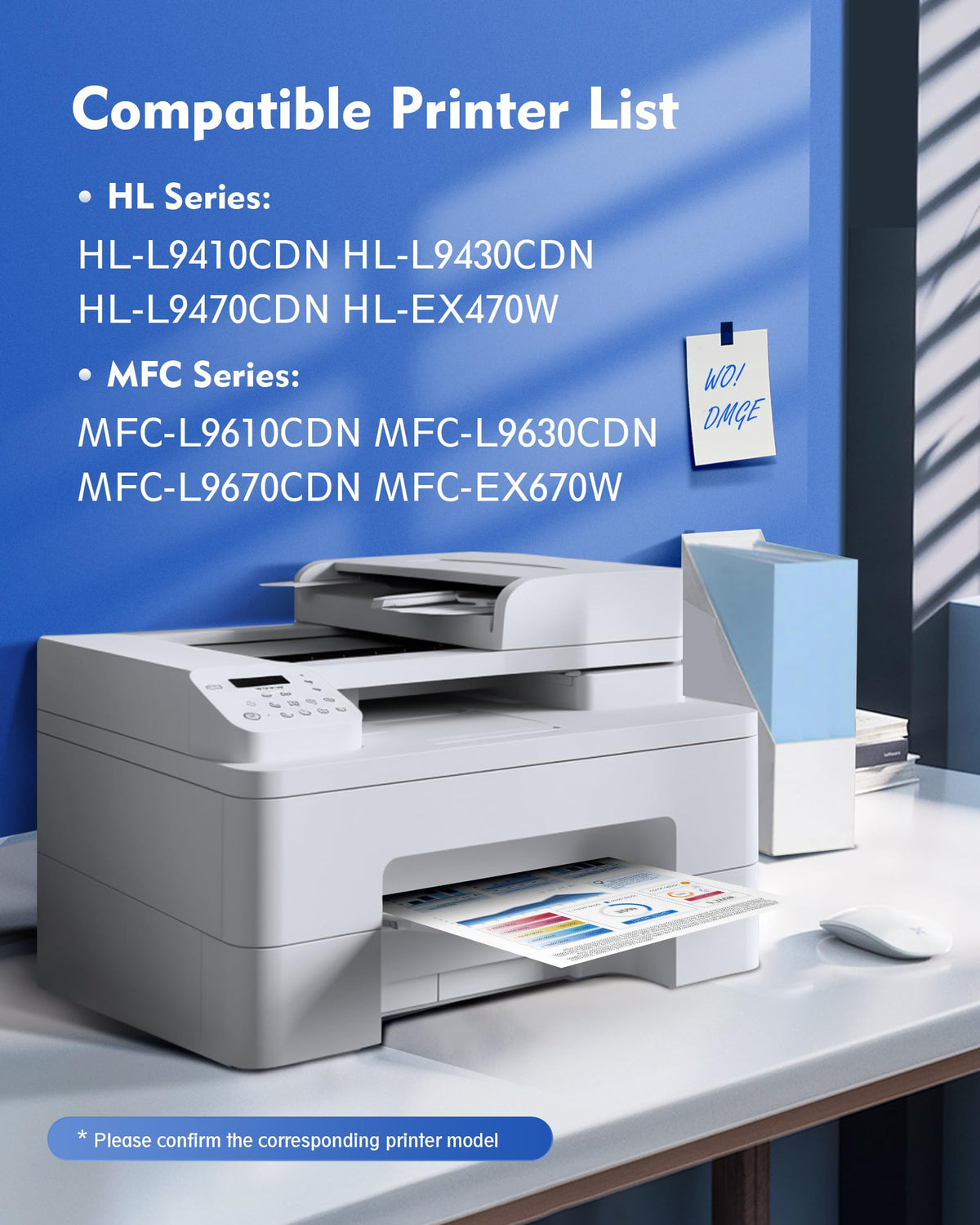 Q: What printers are compatible with the DMGE TN810 TN810XL toner cartridges?A: The DMGE TN810 TN810XL toner cartridges are compatible with several printer models, including MFC-L9610CDN, HL-L9410CDN, HL-L9430CDN, HL-L9470CDN, HL-EX470W, MFC-L9630CDN, and FC-L9670CDN series printers.