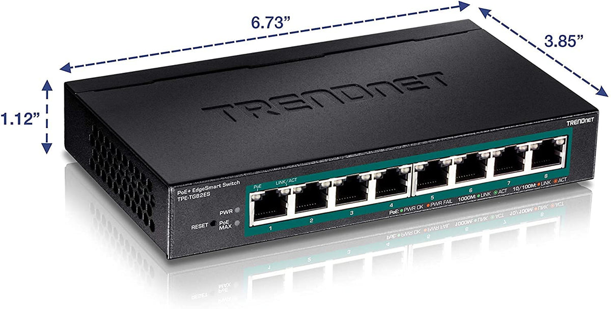 Trendnetas 8-Port Gigabit Edgesmart Poe+ Switch, Model Tpe-Tg82Es, Is A Cost-Effective Desktop Poe Managed Switch Solution For High-Speed Gigabit Poe+ Applications. This Edgesmart Switch Features The Most Commonly Used Managed Switch Features, Reducing Unnecessary Switch Complexity. The Web-Based Management Interface Offers Features For Traffic Control, Static Link Aggregation, Rstp, Vlan, Qos, And Monitoring. Trendnetas Tpe-Tg82Es Desktop Poe Managed Switch Provides Eight Gigabit Poe+ Ports For Connecting Devices Such As Wireless Access Points, Ip Cameras, And Voip Handsets.Edgesmart Managementprovides An Easy-To-Use Web-Based Management Interface For Reduced Switch Configuration Complexity And Offers A Combination Of More Commonly Used Smb Management Features For Easy Deployment.Integration Flexibilitymanaged Features Include Loopback Detection, Rstp, Static Link Aggregation, Vlan, Igmp Snooping, And Qos For Flexible Network Integration.Poe+ Powera 64W Poe Power Budget Supplies Up To Eight Power Over Ethernet Devices.Package Contentsa Tpe-Tg82Esa Quick Installation Guidea Power Adapter (54V Dc, 1.67A)
