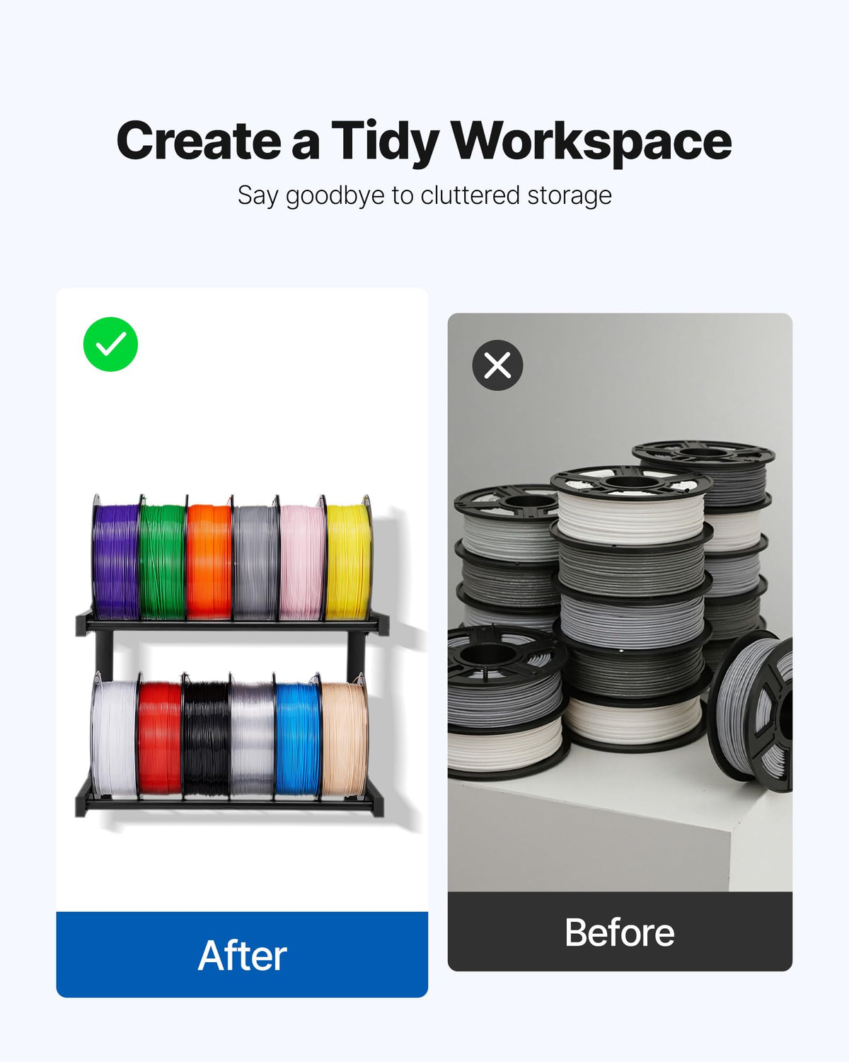Strong Load Capacity: This Filament Storage Rack Supports 20 Lbs Per Shelf (40 Lbs Total), Ideal For Storing 3D Materials. Made From Durable Carbon Steel, It Keeps Everything Secure And Stable, Helping Boost Your Workflow | Neat Storage Solution: This Wall-Mounted Filament Rack Features Two Tiers, Each Holding 6 Spools, With A Total Capacity Of 12 Spools. It Keeps Your Workspace Tidy And Efficient, Making It Easy To Access Your 3D Materials When You Need Them | Fits Various Sizes: With Adjustable Pipe Spacing (5/6 Inches), This Filaments Spool Holder Fits A Variety Of Spool Sizes (200-1000 G). It