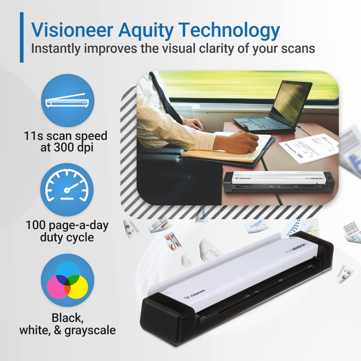Q: What is the scanning speed of the Visioneer RoadWarrior 3?A: The Visioneer RoadWarrior 3 Simplex Mobile Document Scanner scans at a speed of 11 seconds per page at 300 dpi, making it efficient for quickly digitizing documents.