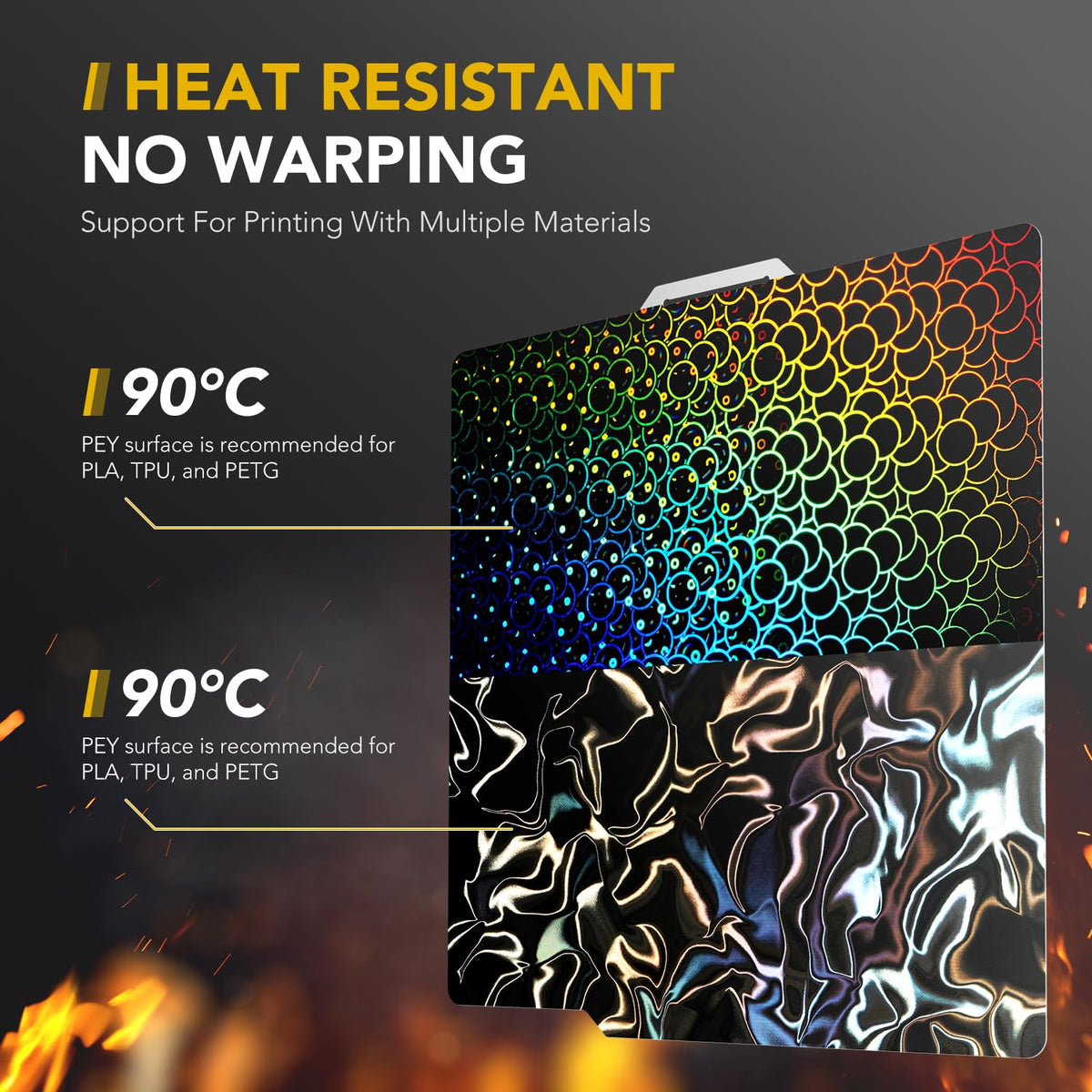 Q: What types of materials can I print on the Vokelater PEY build plate?A: The Vokelater PEY build plate is compatible with various materials, including PLA, TPU, and PETG. It can withstand temperatures up to 90°C, making it a versatile choice for different printing projects.