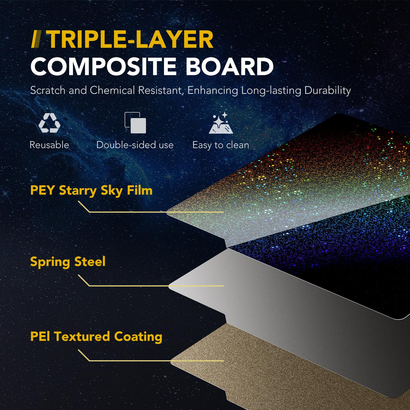 ?Pey+Pei Dual Texture Design?Bambu Lab Build Plate Made Of Elastic Steel Plate, Is Covered With Pey Material On One Side, Presenting A Unique Shimmering Starry Texture That Adds A Splendid Visual Effect To Your 3D-Printed Objects. What'S Even More Amazing Is That It Exhibits Different Pattern Variations Under Varying Light Intensity And Angles. The Other Side Has A Pei Frosted Texture Surface, Capable Of Printing Frosted Works. One Plate, Two Textures, Meeting Different Printing Needs.