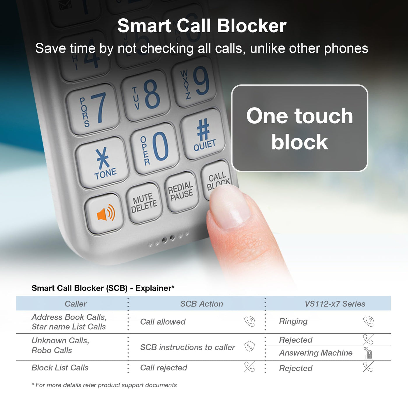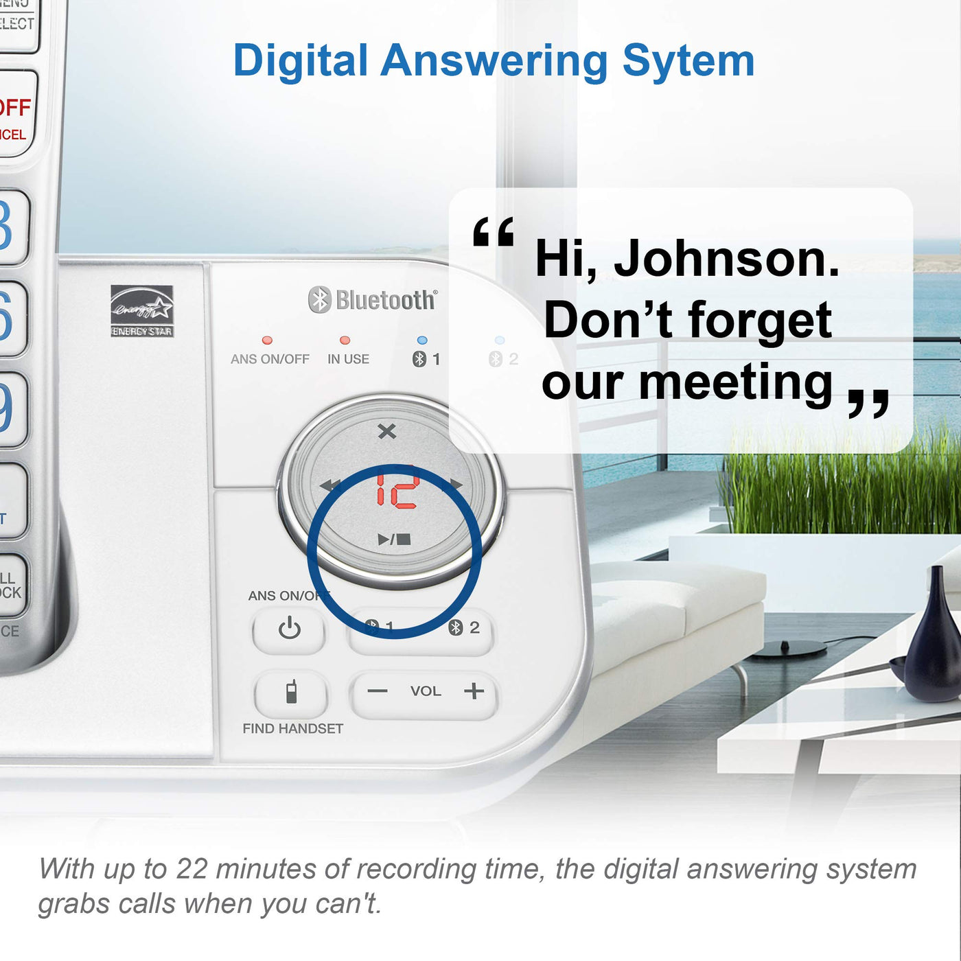 Smart Call Blocker This System Lets You Block Nuisance Callers On The Spot With One Touch. You Can Permanently Blacklist Up To 1,000 Numbers. Whats More, It Can Filter Robocalls And Unwanted Call While Allowing Welcome Calls To Get Through. For Screen Out Robocalls, Set It To Ask The Callers To Press The Pound Key. For Screen Out Unknown Callers, Set It To Ask The Callers To Record Their Names And Press The Pound Key. After Your Caller Completes The Request, The Phone Rings And Announces The Callers Name. You Then Can Choose To Block Or Answer The Call, Or Forward The Call To The Answering System. | Bluetooth Connect To Cell Make And Receive Calls From Your Cellular Plan While Enjoying The Comforts Of A Home Phone. Pair Up To 2 Cell Phones And Connect 2 Cell Phones, Or One Cell Phone And One Bluetooth Headset For Use With Landline Calls. With A Touch Of A Button, Enjoy The High-Tech Benefits Your Smart Phone Offers. Even If Your Smart Phone Is In A Different Room, You Can Still Access Siri Or Google Now From The Cordless Handsets. Place A Call, Write Or Read A Text And Perform All The Other Actions These Services Offer. | Digital Answering System With Voice Guide This Cordless System Includes A Digital Answering Machine That Has A Led Message Counter, And Records Up To 22 Minutes Of Incoming Messages, Outgoing Announcements And Memos. A Built-In Voice Guide Can Help You To Set Up The System Easily. | Large 2-Inch Screen, Big Text, Lighted Key Pad High-Contrast Text On The Extra-Large 2 Inch Screen Makes It Easy To Read Incoming Caller Id Or Call History Records. Plus, The Enlarged Font And Extra-Large And Lighted Handset Keypad Allows For Easy Dialing In Low-Light Conditions. This Feature Is Especially Helpful For Those Who Are Visually Impaired. | Speakerphone And Visual Ringer This Cordless System Has Built-In A Full-Duplex Speakerphone On Handset Allowing Both Ends To Speak - And Be Heard - At The Same Time For Conversations That Are More True To Life. Also Designed With A Lighted Up Visual Ringer On Top Of The Handset For Noisier Environments, Or For Those With Weakened Hearing.