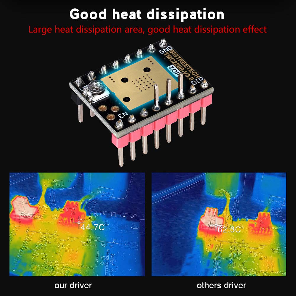 Q: What cooling measures are recommended for the TMC2208 driver during operation?A: It is essential to implement heat dissipation measures, such as using a heat sink and cooling fan, to prevent the TMC2208 driver from overheating and ensure stable operation during use.