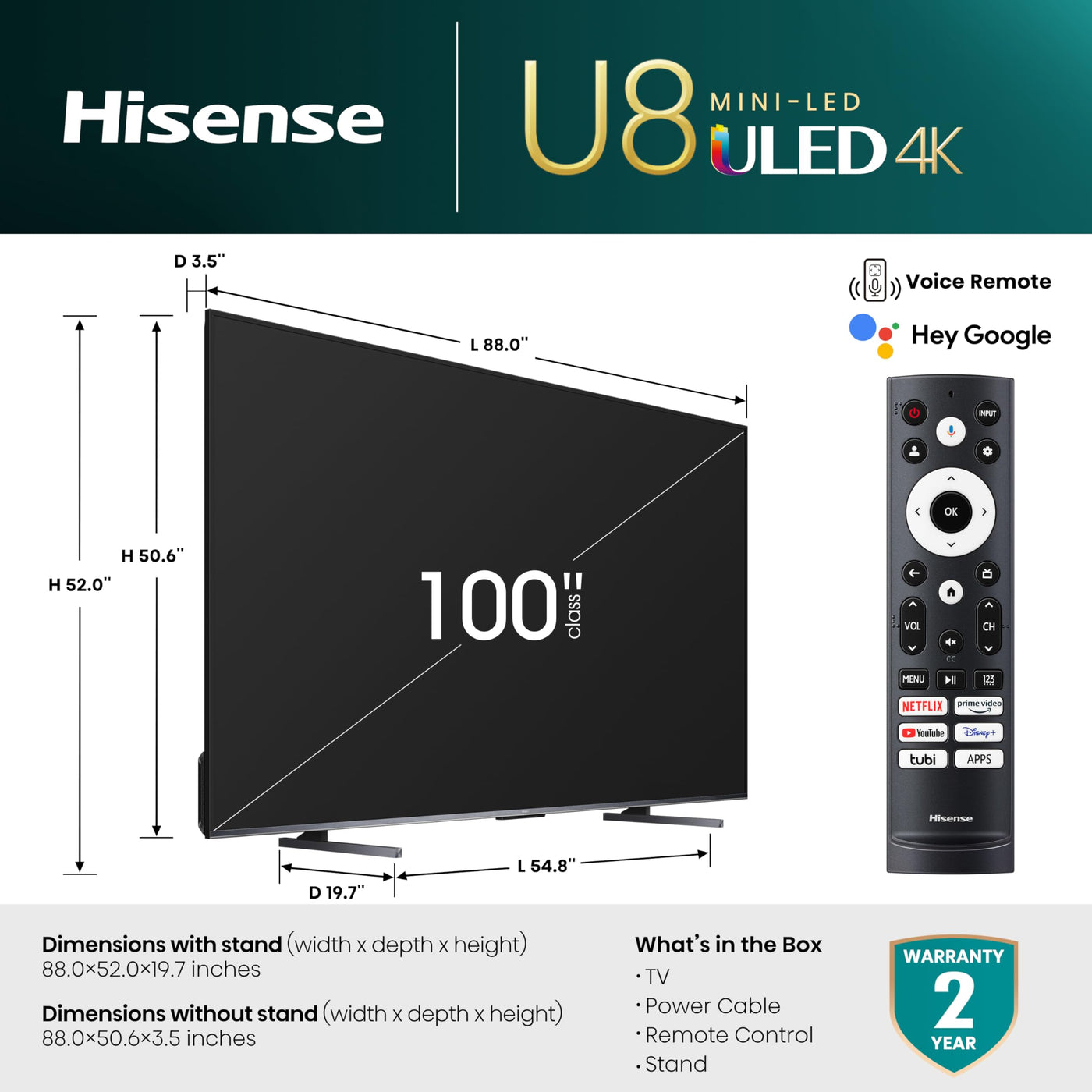 Hisense 100-Inch Class U8 Series Mini-Led Uled 4K Uhd Google Smart Tv (100U8K) - Qled, 480 Motion Rate, 144Hz Game Mode Pro, Dol