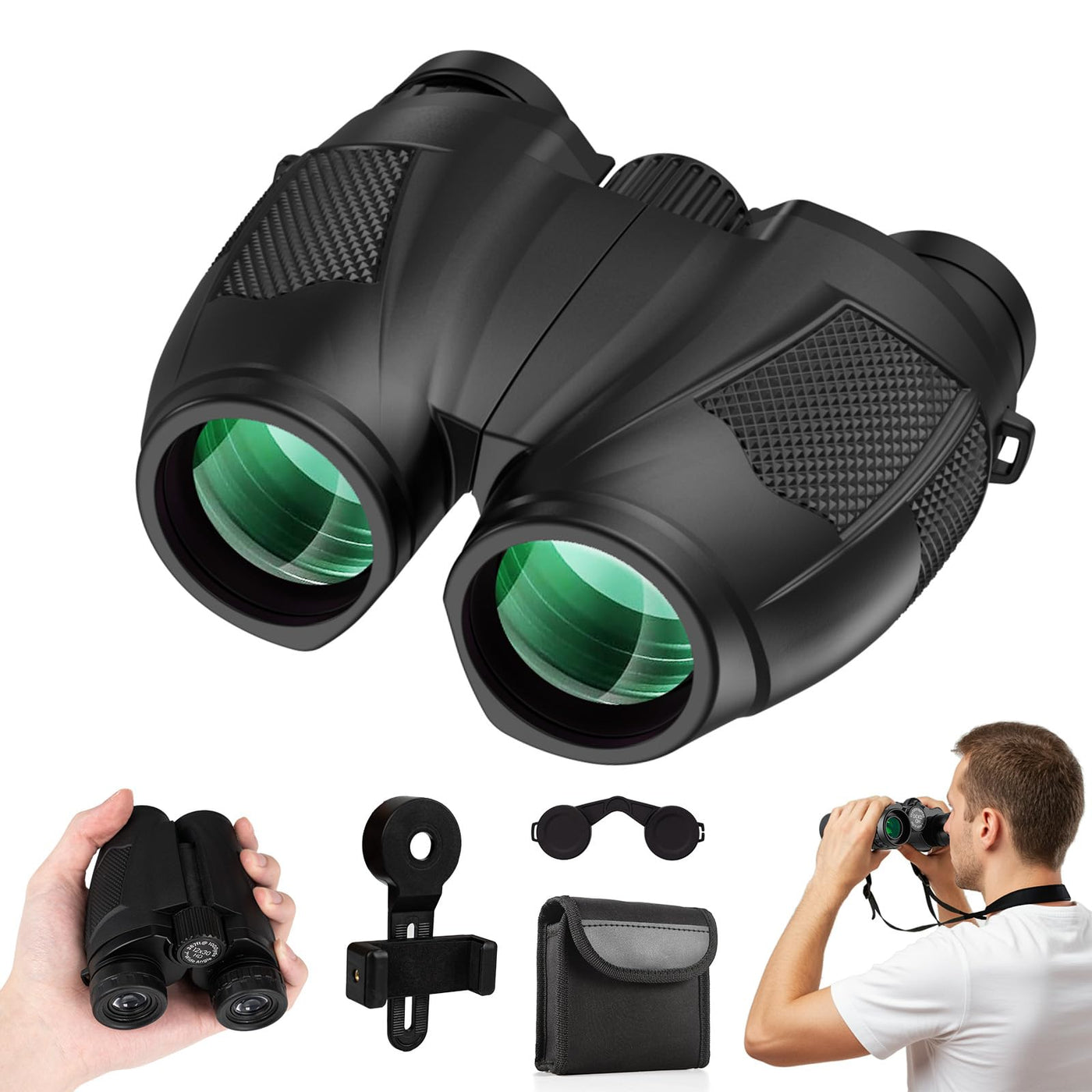 LIGHTWEIGHT SMALL COMPACT BINOCULARS : Weighing only in 0.5 pounds, the Urbancoast lightweight compact binoculars for travel can be folded into palm-size and can be carried all day long, no matter if its for adults or kids. | 12X30 POWERFUL HIGH-DEFINITION BINOCULARS : With 12x magnification and 30mm large objective lens, Urbancoast small binoculars for adults and kids deliver 367ft/1000yds large field of view with clear and crisp images,letting you look father and see wider.The large eyepiece promises an immersive, comfortable viewing experience. With BAK4 prism and FMC lenses. | BINOCULARS WITH PHONE ADAPTER : With the included smartphone adapter that fits almost all smartphones on the market, you can easily take photos through these binoculars. | BINOCULARS FOR GLASS WEARERS OR NOT : Our compact binocular can be pull down the rubber eyepieces and more fit the glasses wearer, getting close to lens and see easily. | LIFE WATERPROOF BINOCULARS & GIFT CHOICE : Daily Waterproof fog-proof body with rubber coated finish, durable and portable in outdoors, even suitable for hostile environments.