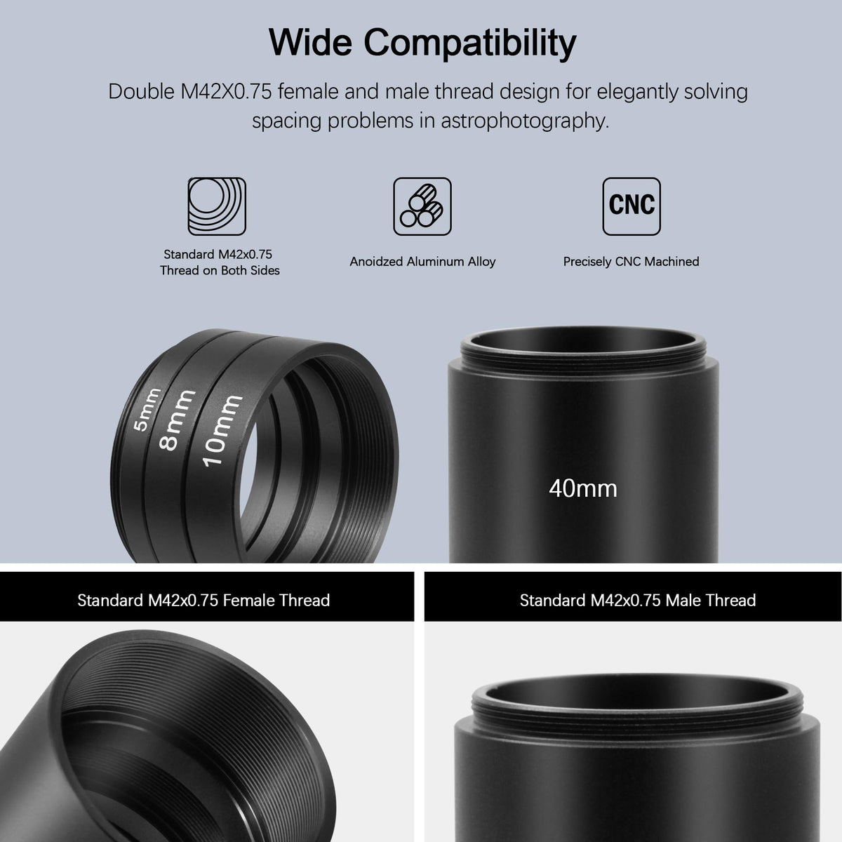 Astromania Astronomical T2-Extension Tube Kit For Cameras And Eyepieces - Length 5Mm 8Mm 10Mm 40Mm - M42X0.75 On Both Sides