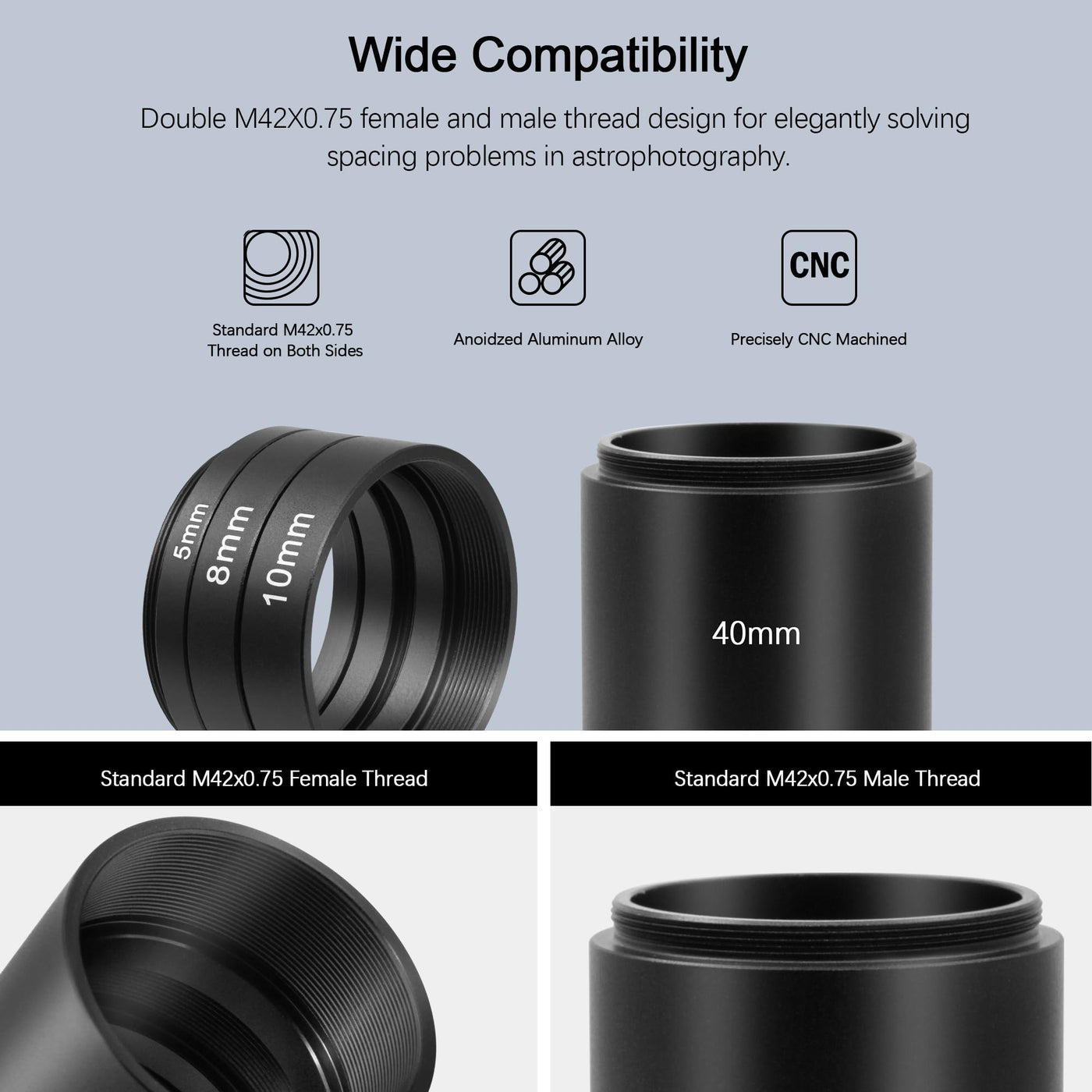 Sometimes You Cannot Get To The Right Focal Plane For Focusing With A Camera Or Eyepiece. This Extension Tube Kit Solves This Problem. You Can Use This Extender With Any Camera Or Eyepiece Or With Various Adapters. The M42*0.75 Threads On Both Ends Make It Extremely Versatile. Use This Extender For Obtaining The Correct Image Scale Or For The Exact Spacing Required For A Reducer Or Field Flattener. You Can Reach The Extension Length Required By Combining Several Extenders Of Different Lengths.