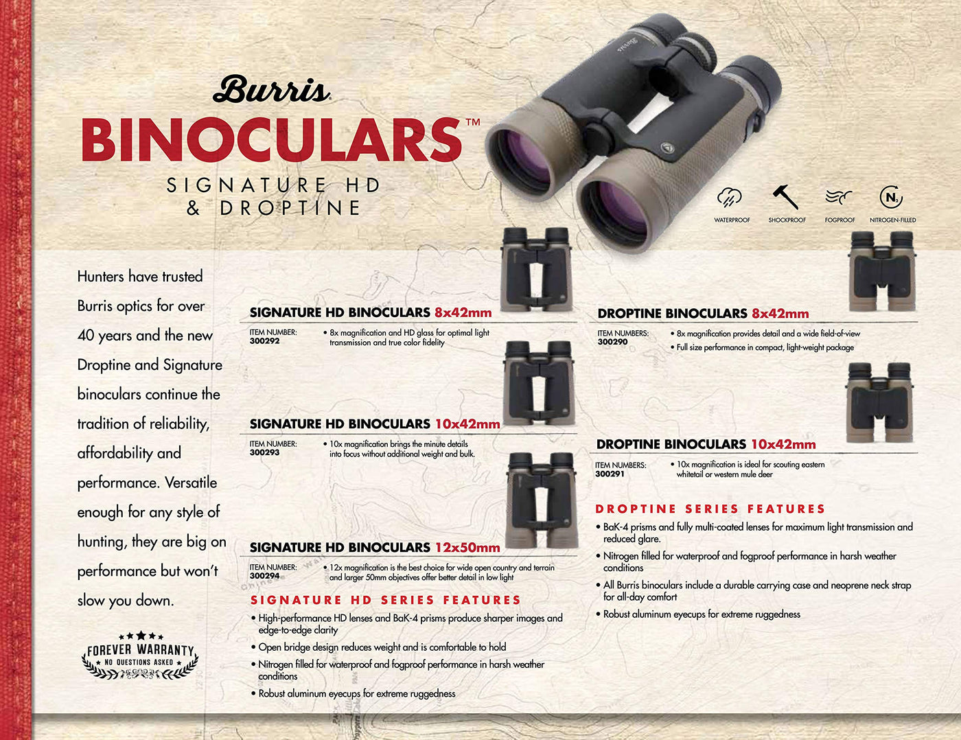 Hunters Have Trusted Burris Optics For Over 40 Years And The New Droptine And Signature Binoculars Continue The Tradition Of Reliability, Affordability And Performance. High-Performance Hd Lenses And Bak Prisms Produce Sharper Images And Edge-To-Edge Clarity. Step Up Your Game With Legendary Burris Optics. Performance And Reliability You Can Trust. Features: - All Lenses Are Fully, Multi-Coated For Maximum Light Transmission And Reduced Glare- Versatile Enough For Any Style Of Hunting- Phase-Corrected Bak Roof Prisms Produce High Resolution Images From Close Up To Far Away- The Open Bridge Design Reduces Weight And Is Comfortable To Hold- Nitrogen-Filled For Waterproof, Fog Proof Performance. - Outer Surfaces Are Rubber Armored For Protection And A Sure Grip Includes: - Durable Carrying Case - Neoprene Neck Strap Specifications: - Prism Type: Roof- Magnification: 12X- Objective Lens Diameter: 50Mm- Angle Of View: 4. 8Actual- Field-Of-View: 251. 0 @ 1000 Yd - Minimum Focus Distance: 13. 1 - Exit Pupil Diameter: 4. 2 Mm- Eye Relief: 15. 5 Mm- Interpupillary Adjustment: 2. 2 - 2. 9- Dioptric Correction: Not Specified By Manufacturer- Focus Type: Center- Tripod Mount: None- Dimensions: 6. 5 X 5. 1 X 2. 3- Weight: 24. 3 Oz.