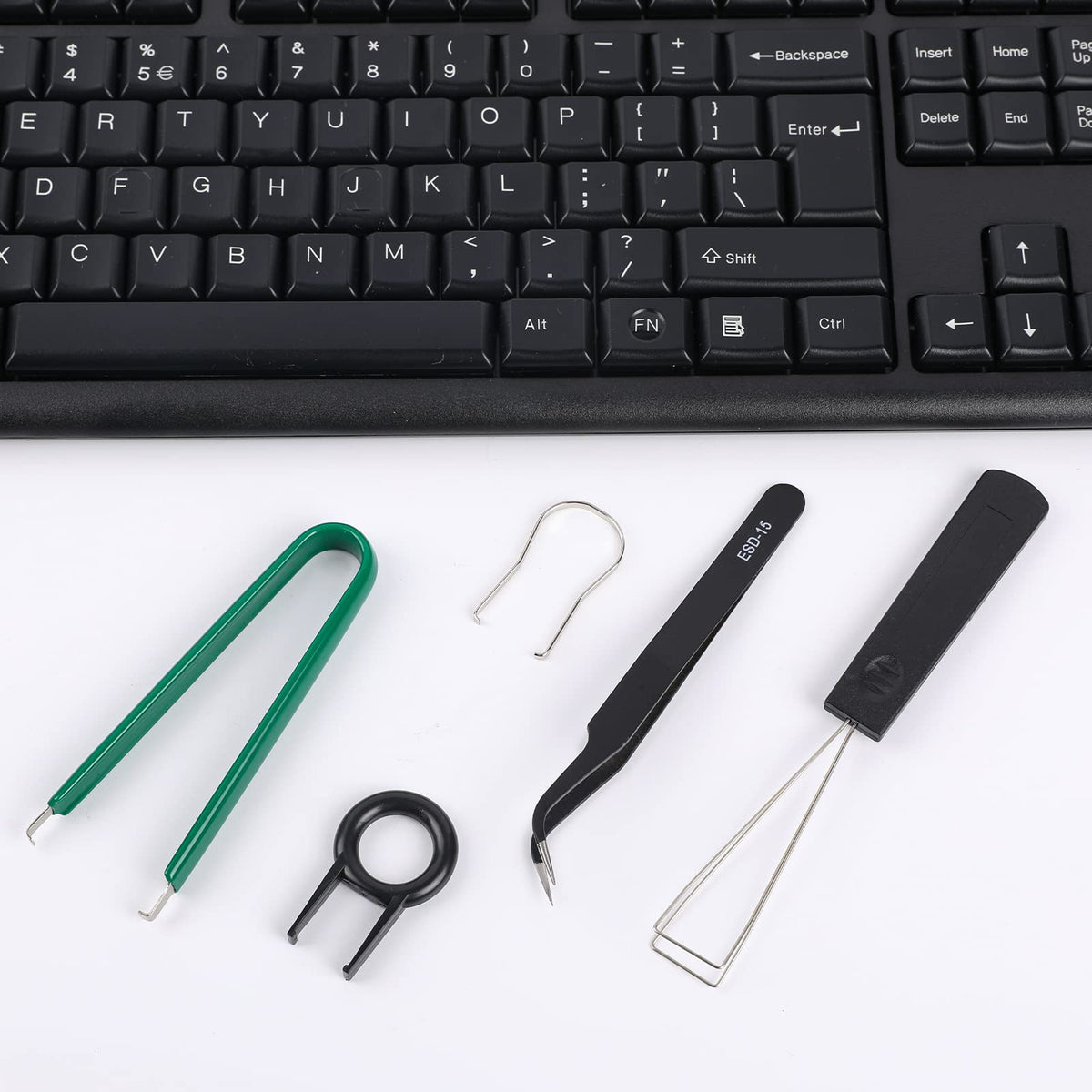 Q: What is included in the 5 Pcs Keyboard Puller Set?A: The 5 Pcs Keyboard Puller Set includes 2 keycap pullers, 2 switch pullers, and 1 tweezer, providing a comprehensive tool kit for mechanical keyboard maintenance.