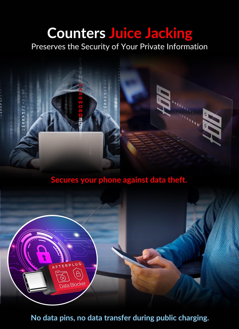 Q: What is the purpose of the Afterplug USB-C to USB-C data blocker?A: The Afterplug USB-C to USB-C data blocker is designed to protect your devices from data theft and hacking while charging in public spaces. It ensures that no data is transmitted between your device and the charging source, allowing for secure charging without the risk of malware or unauthorized access.