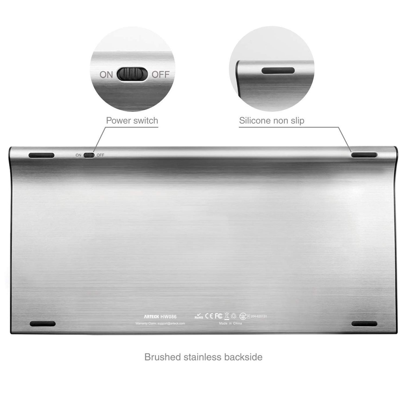 Q: What materials are used in the construction of the keyboard?A: The Arteck Wireless Keyboard is made from high-quality stainless steel, offering a heavy-duty feel along with low-profile keys that provide comfortable and quiet typing experience.