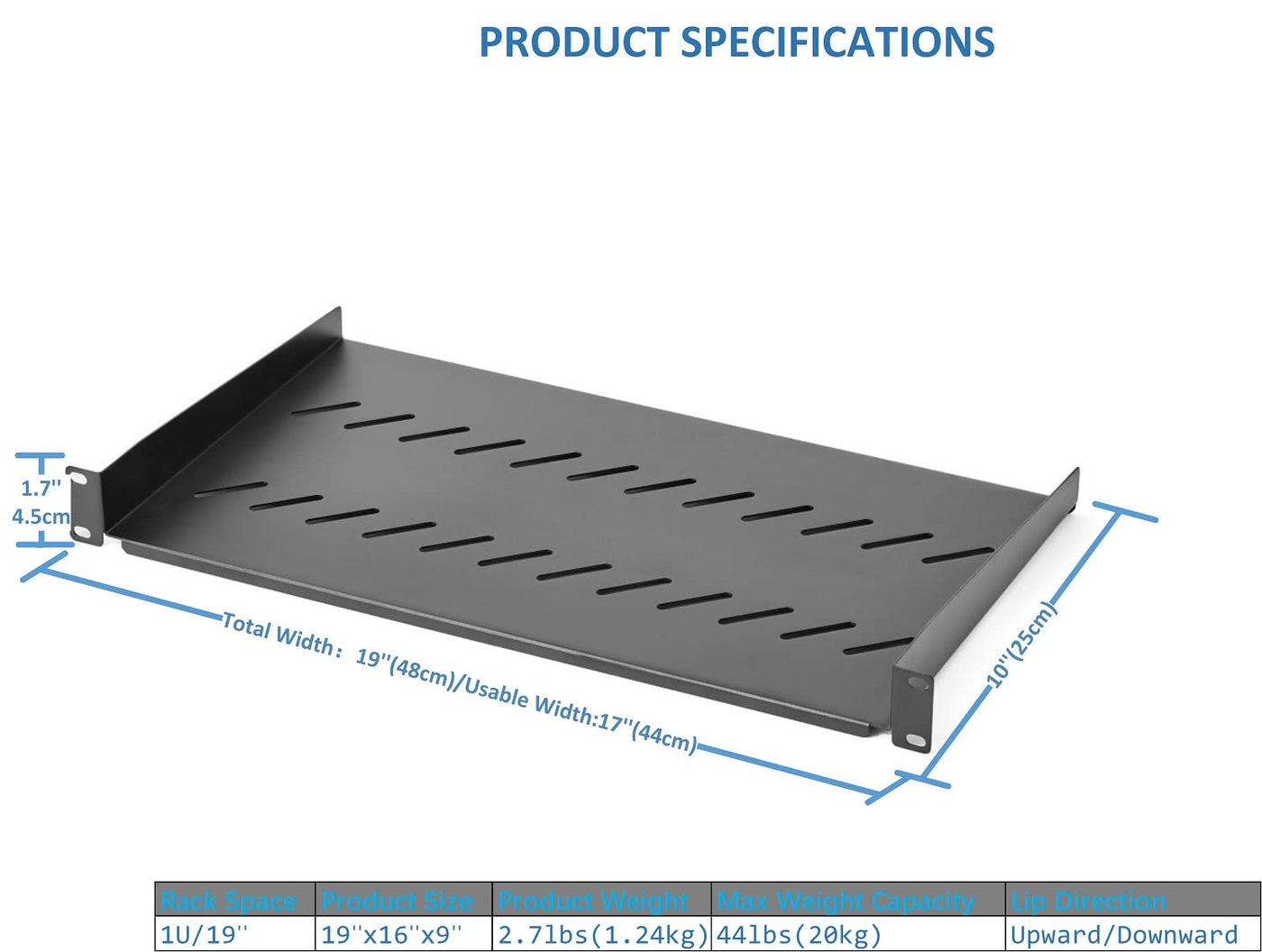 1U Server Rack Shelf Rack Mount Tray 10'' Deep For 19'' Network Cabinet And Equipment Rack Universal Vented Rackmount Shelf Mounting Tray -1U,10'' Deep,Weight Capacity 44Lbs,Black