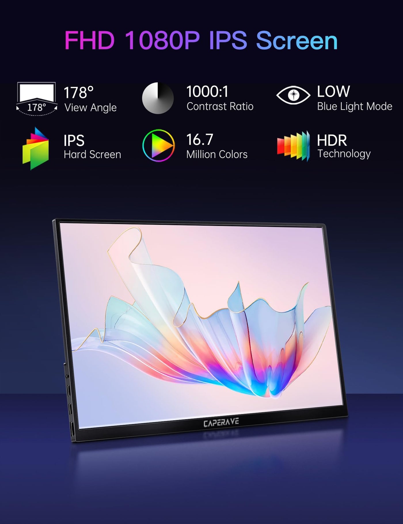 Caperave Portable Monitor For Laptop, 15.6'' 1080P Fhd Travel Monitor With Kickstand & Speaker, Second Monitor Usb C Hdmi, Gamin