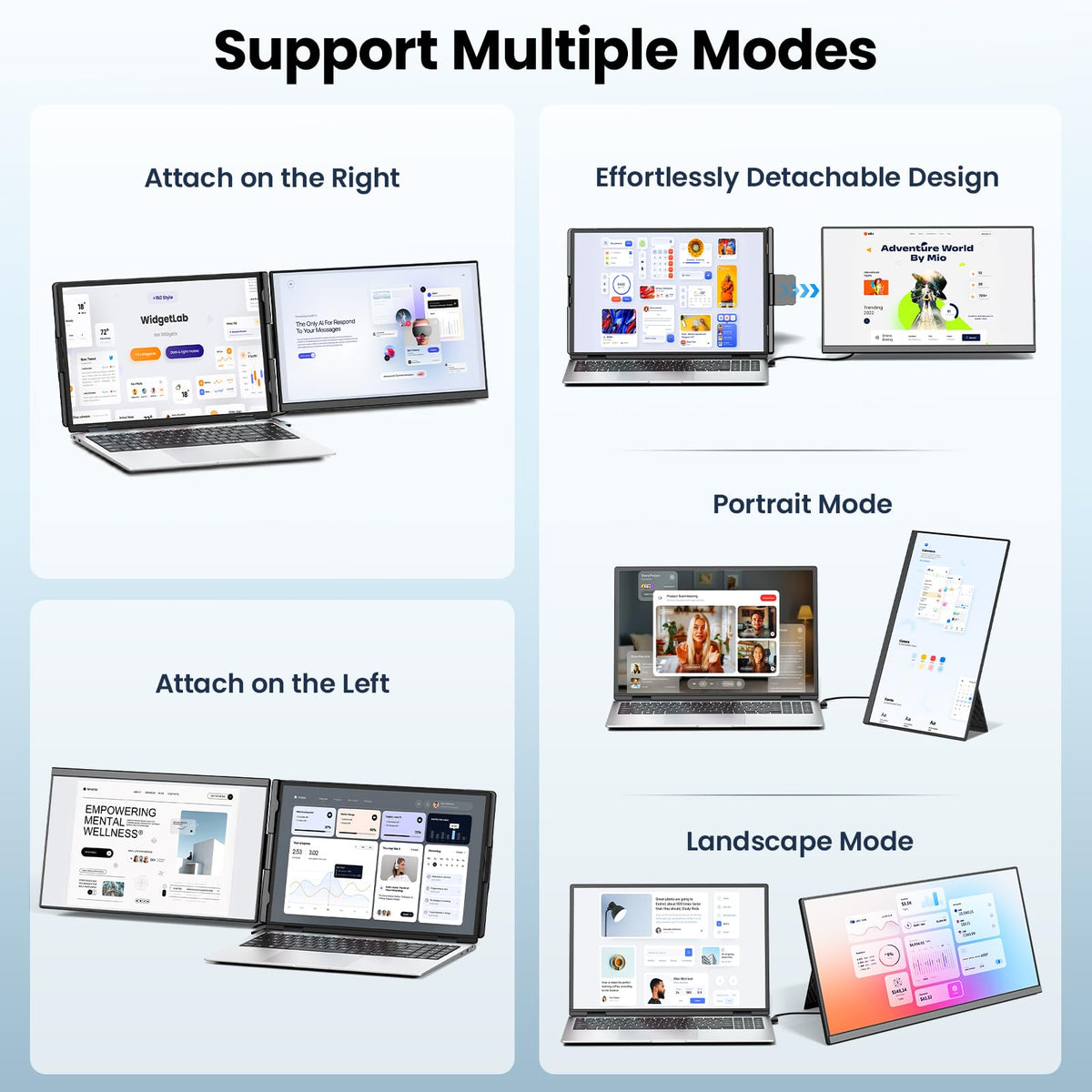 Q: What are the display modes available with this laptop screen extender?A: The Cevaton Laptop Screen Extender offers multiple display modes, including extended, mirrored, and portrait modes. These options allow you to effectively manage your workspace and enhance productivity by accommodating various tasks and screen configurations.