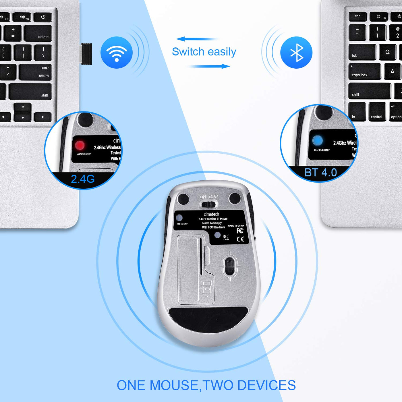 Q: How do I switch between Bluetooth and 2.4G wireless modes on the Cimetech Wireless Bluetooth Mouse?A: To switch between Bluetooth and 2.4G wireless modes, press the Mode Switch Button for 1 second. The power indicator light will help you identify which mode is active: blue for Bluetooth mode and red for 2.4G wireless mode.
