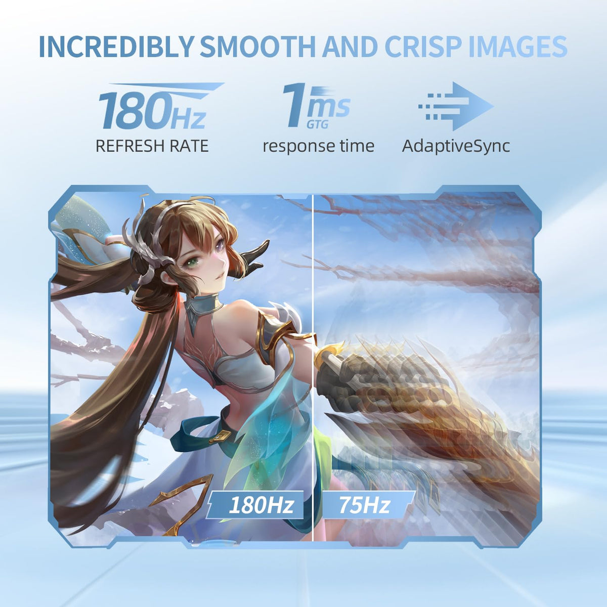 Q: What is the refresh rate of the CUNPU 27 Inch Gaming Monitor?A: The CUNPU 27 Inch Gaming Monitor features an impressive refresh rate of up to 180Hz, providing smooth and responsive visuals that enhance gaming performance.