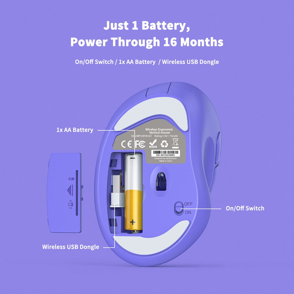 Q: How long does the battery last in this wireless mouse?A: The ergonomic wireless mouse requires just one AA battery and can last up to 16 months, depending on usage and computing conditions. It features a power-saving mode that activates when not in use.