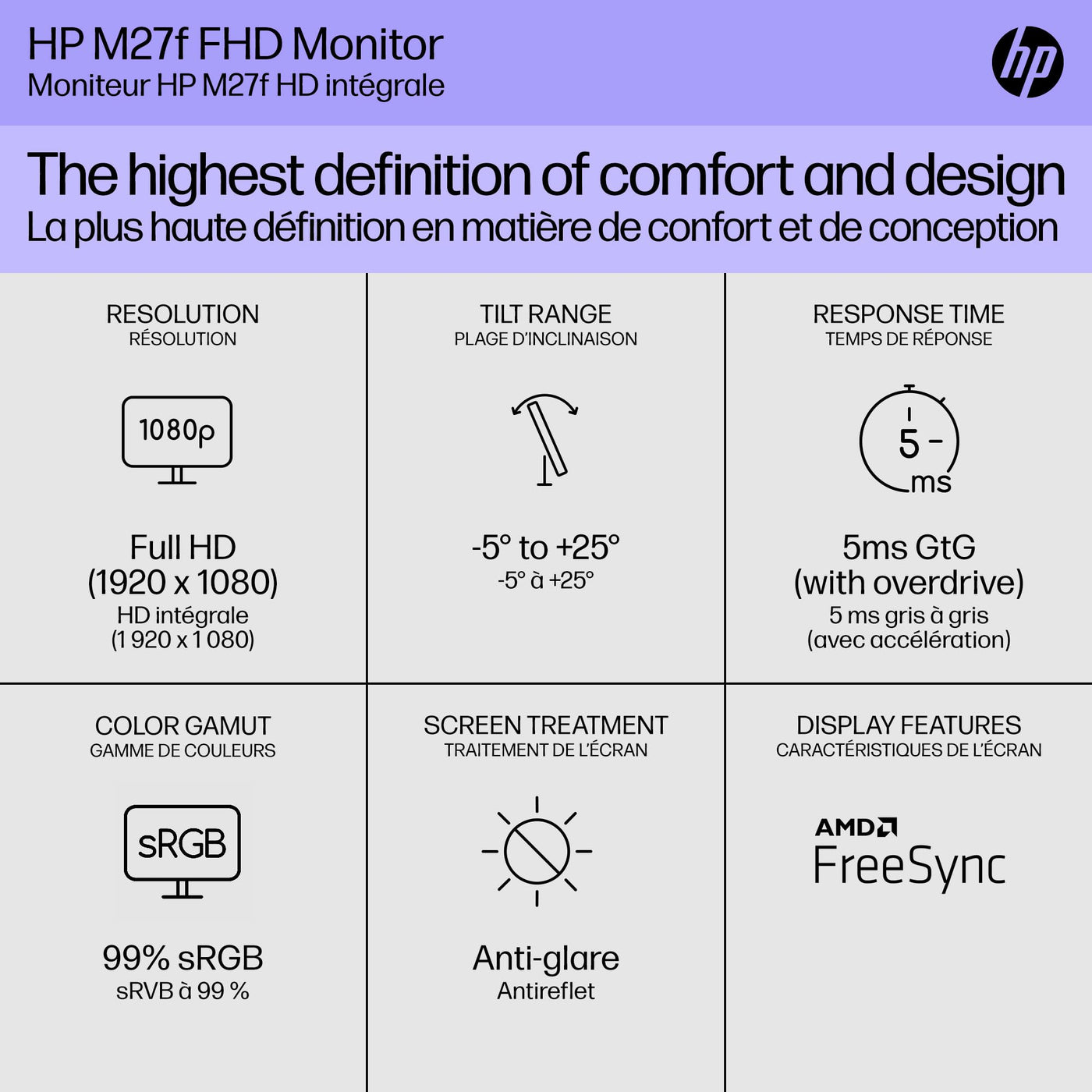 Q: What are the main features of the HP 27-inch M27f FHD Monitor?A: The HP 27-inch M27f FHD Monitor features a Full HD resolution, an ultra-slim design, and a wide viewing angle, making it ideal for both work and entertainment. It also includes VGA connectivity for versatile usage.