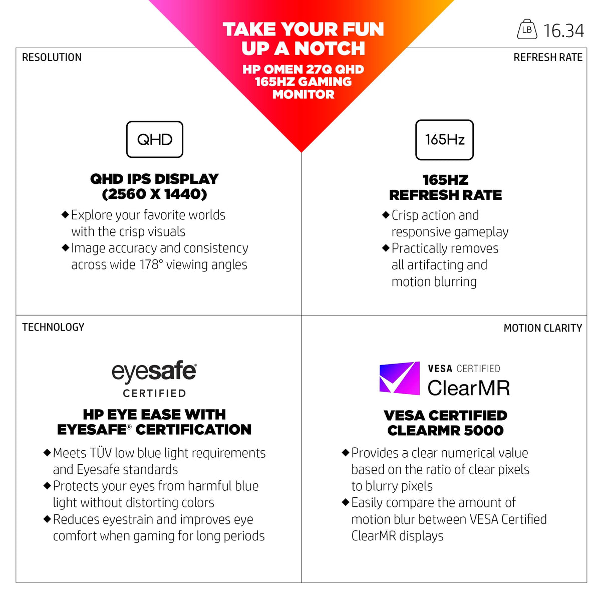 Hp Omen 27Q Qhd 165Hz Gaming Monitor, Qhd Display (2560 X 1440), Ips Panel, 99% Srgb, 95% Dci P3, 16:9, Amd Freesync Premium Tec